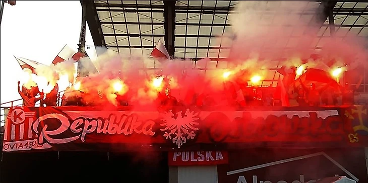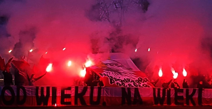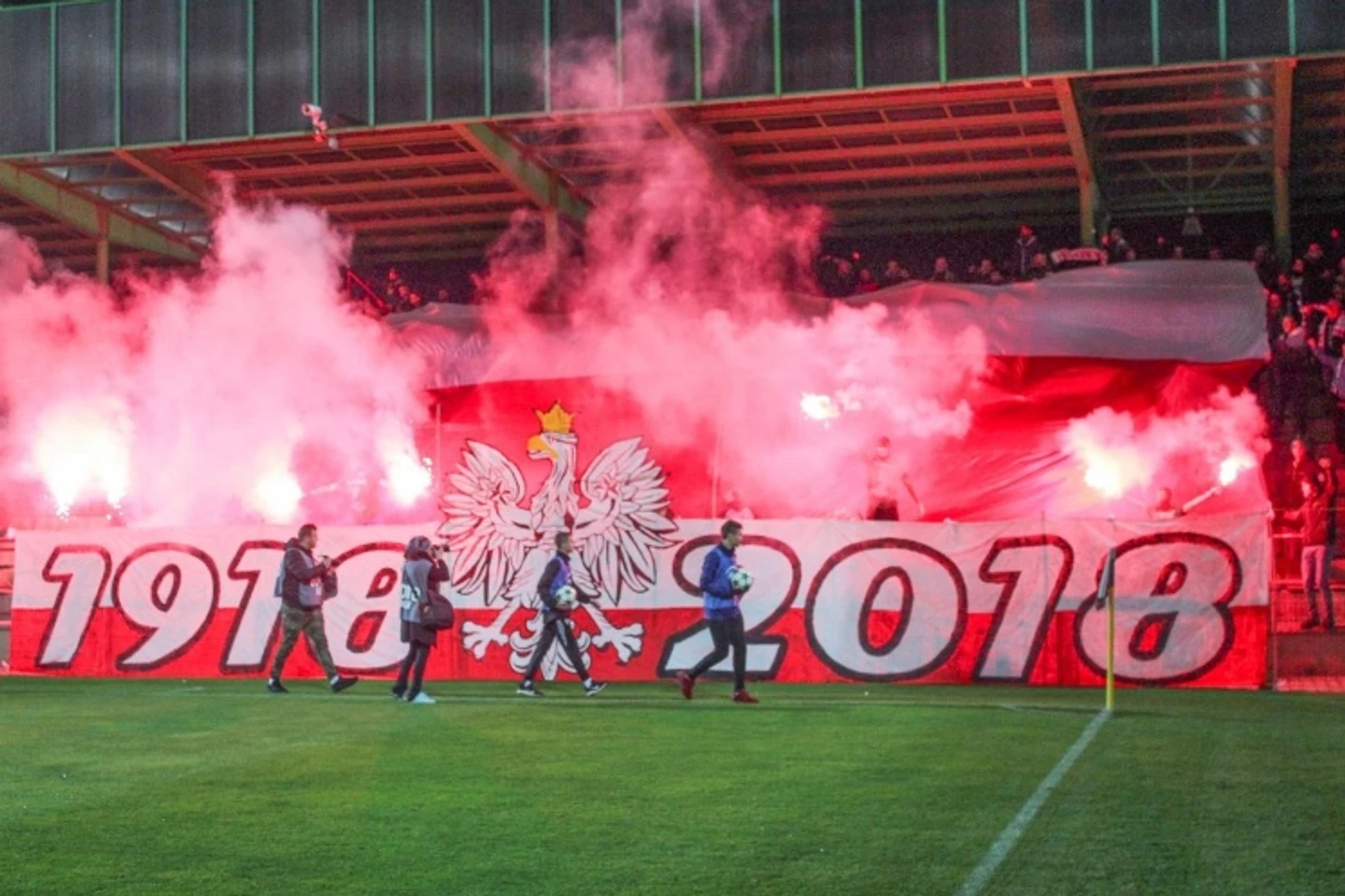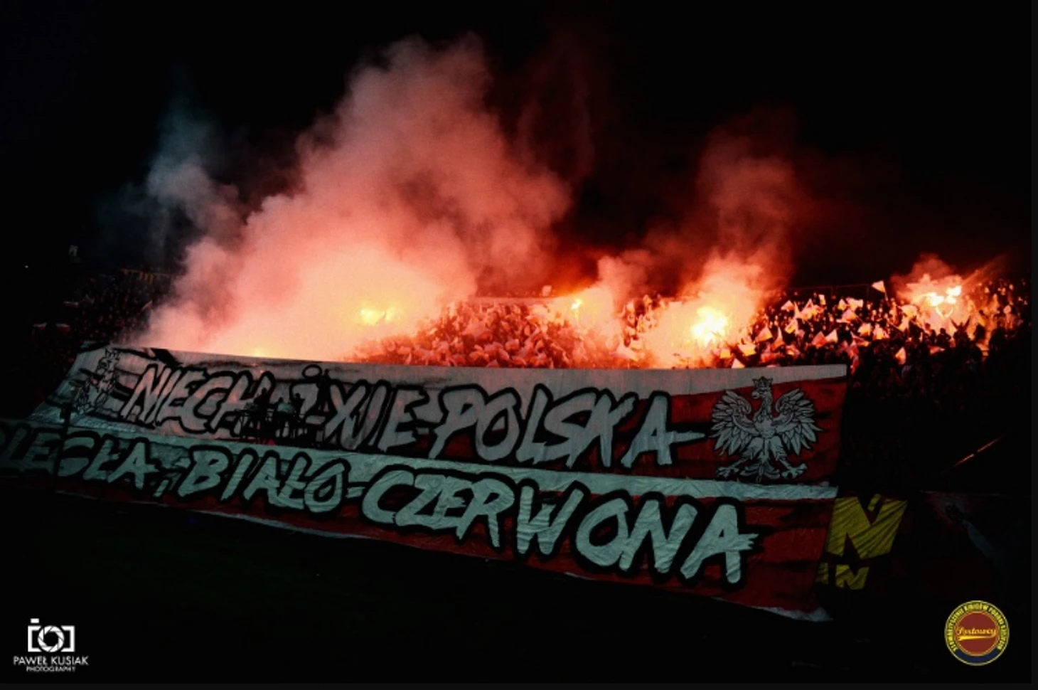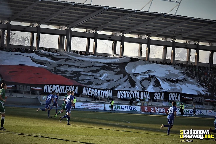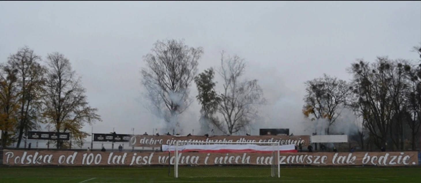 Тема патриотических оправ продолжилась в Радоме. Там на матч местного «Радомяка» с хожувским «Рухом» собрался полный стадион, а фанаты хозяев подготовили оправу «Независимая, непокорная, окрыленная сила орла».