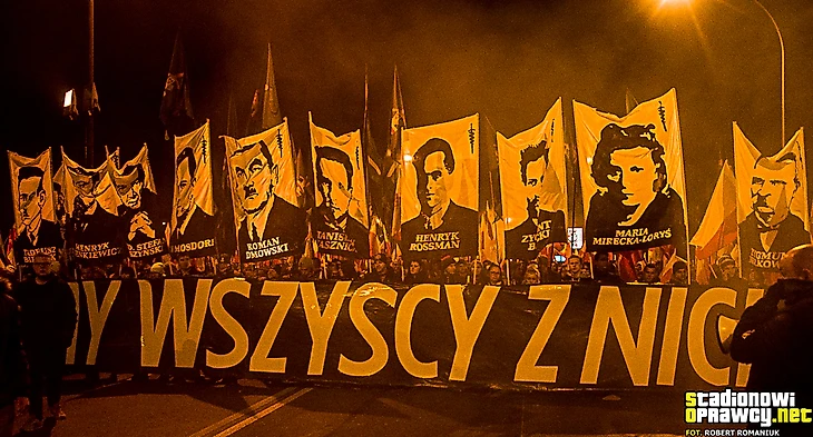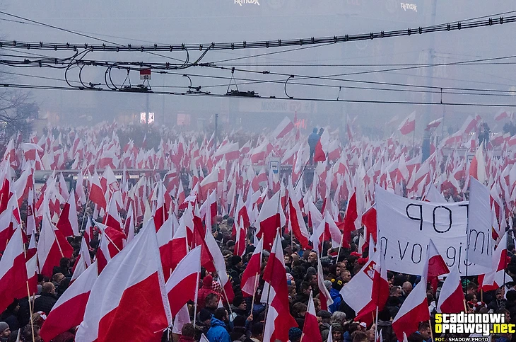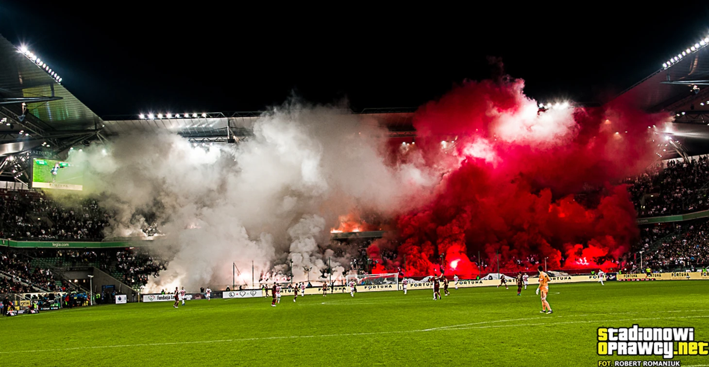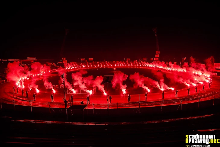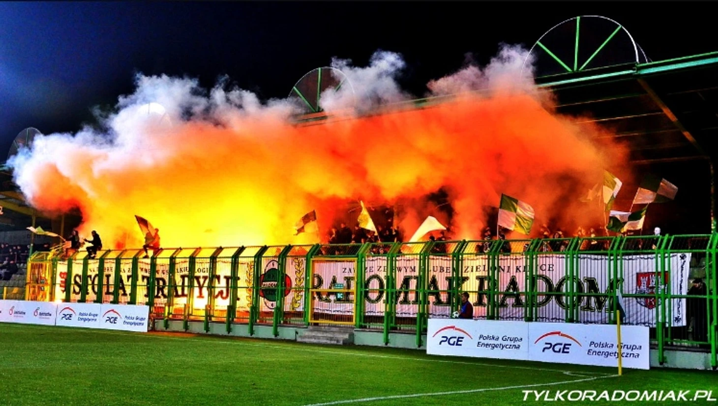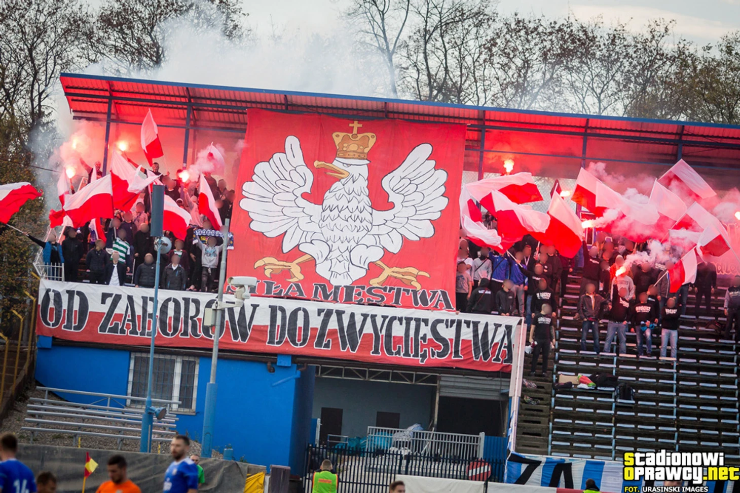 Тема патриотических оправ продолжилась в Радоме. Там на матч местного «Радомяка» с хожувским «Рухом» собрался полный стадион, а фанаты хозяев подготовили оправу «Независимая, непокорная, окрыленная сила орла».