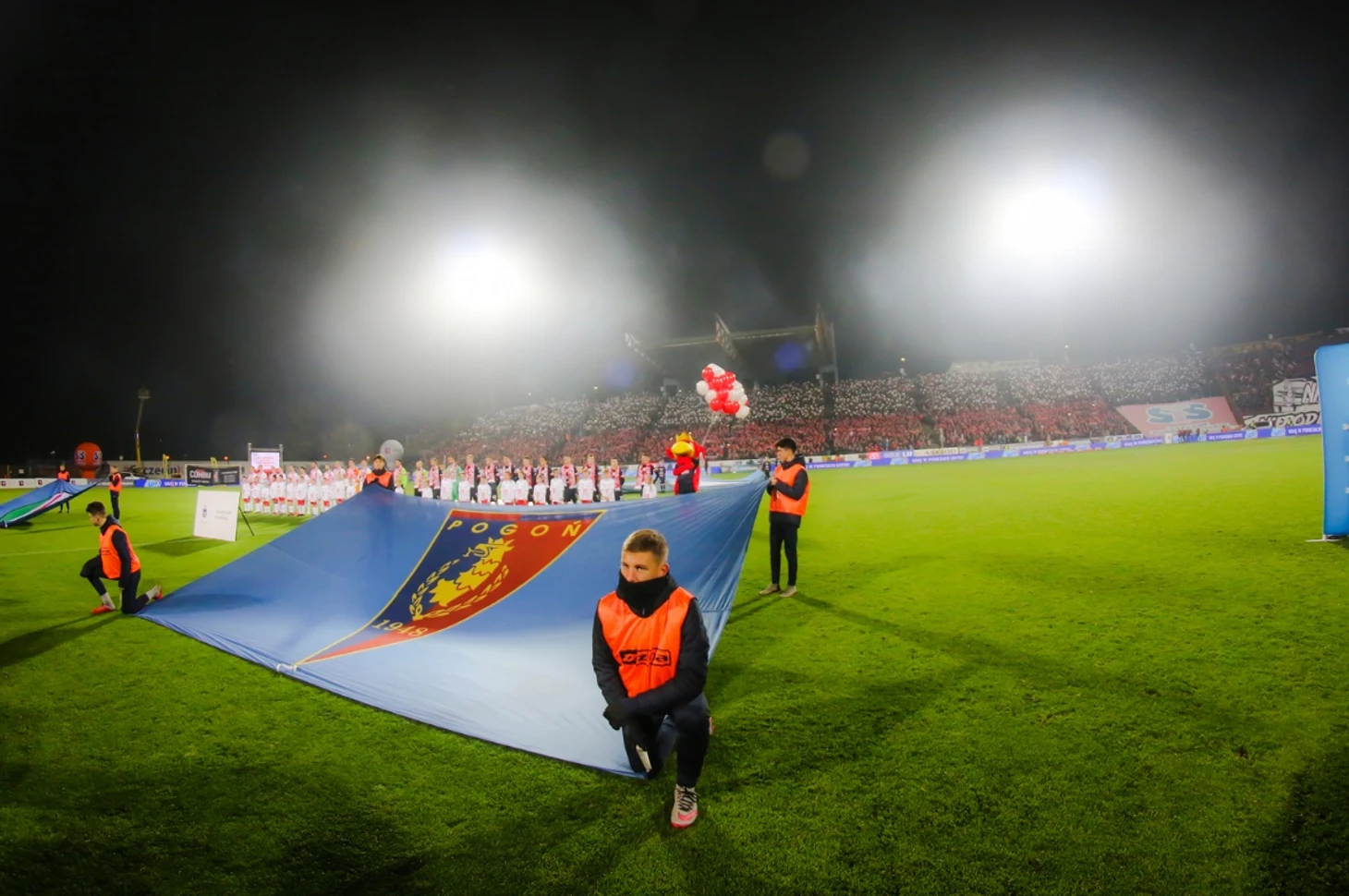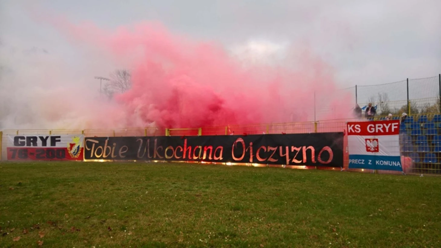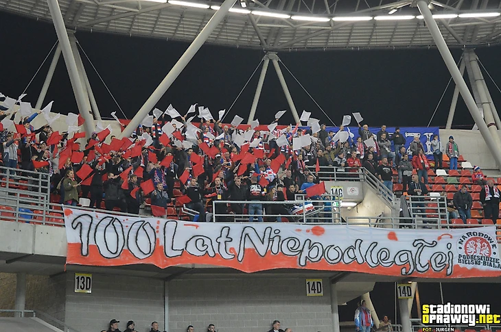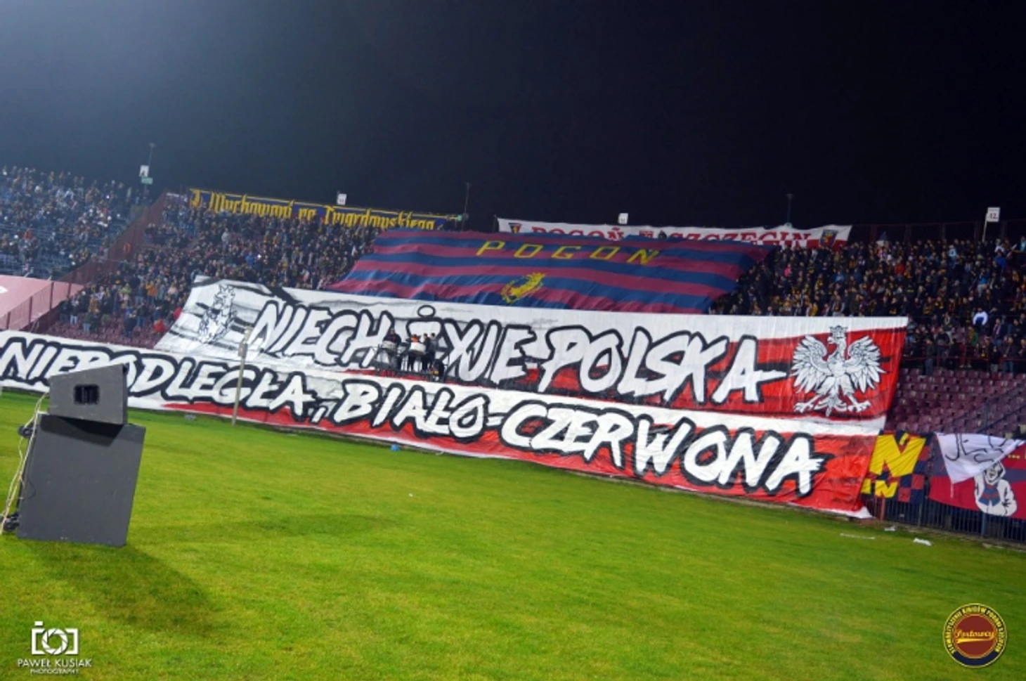 Фанаты щецинской «Погони» подготовили баннер «Пусть живет Польша. Независимая, бело-красная» и пиротехнику. На центральной трибуне же во время исполнения гимна болельщики подняли море бело-красных шариков.