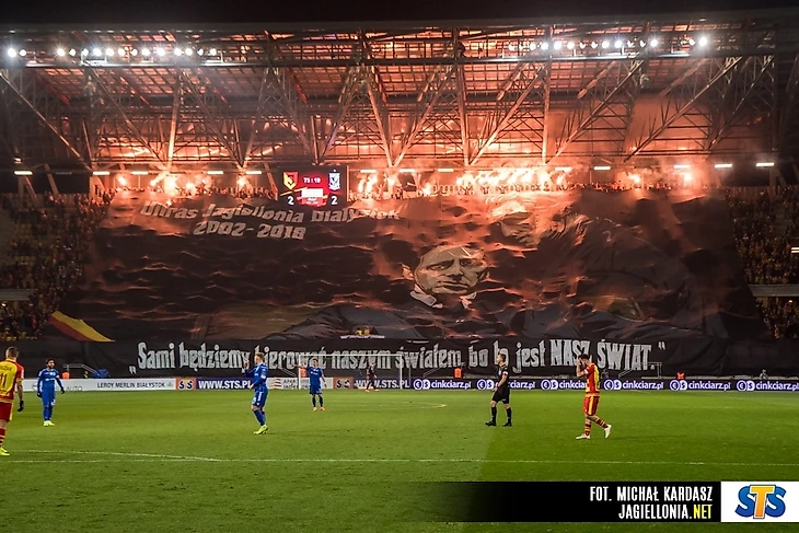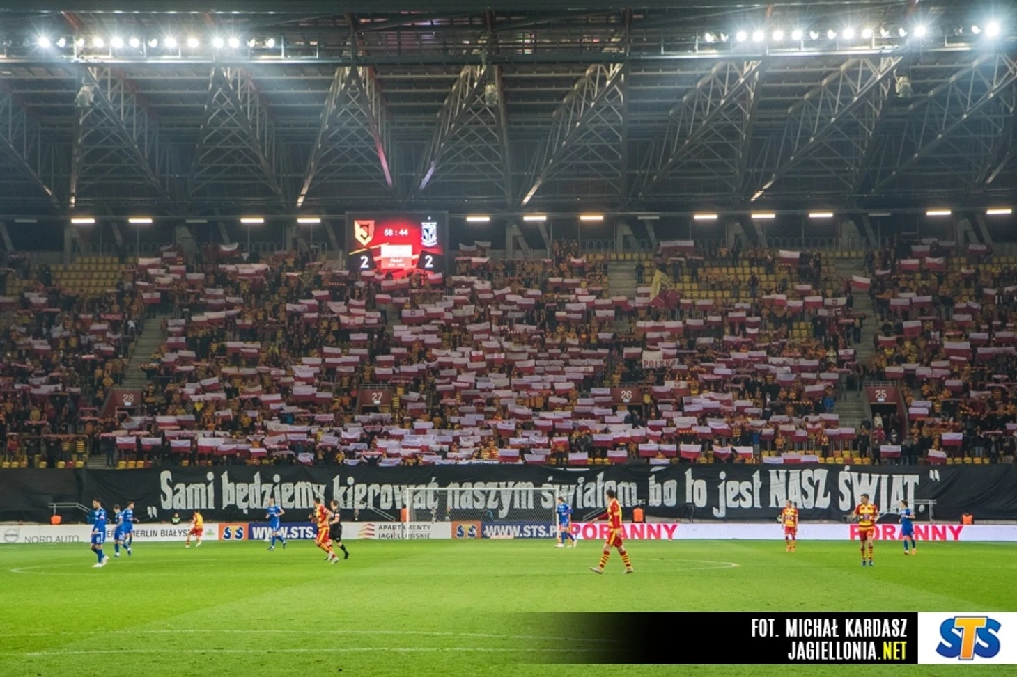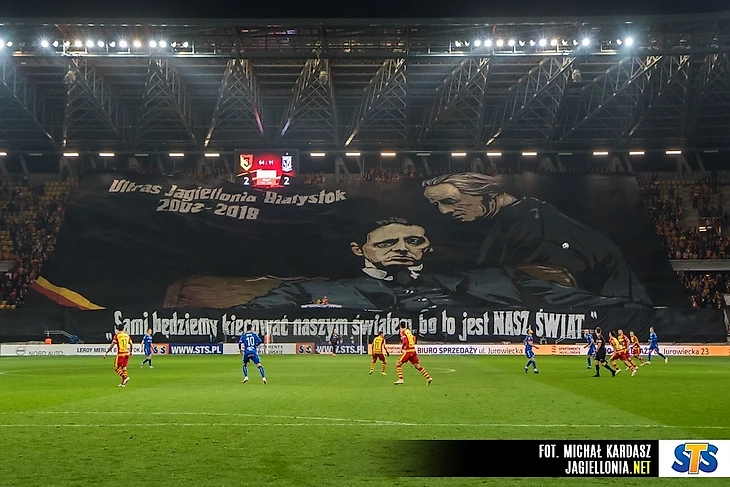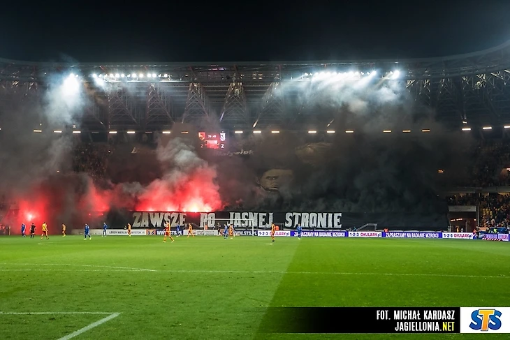 «Ягеллония» - «Лех». Большое количество польских флагов и оправа к 16-летию ультрас группы хозяев «Сами будем управлять нашим миром, потому что это НАШ МИР....Всегда на светлой стороне»