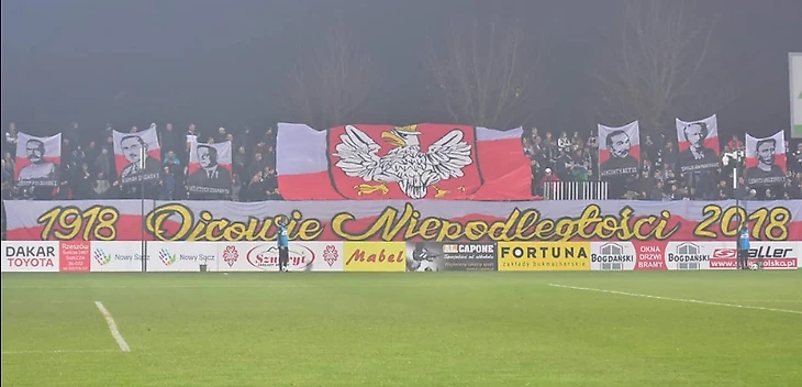 «Подбескидзе» - «ГКС» Катовице. Баннер «100 лет независимой» и небольшие флажки от хозяев.