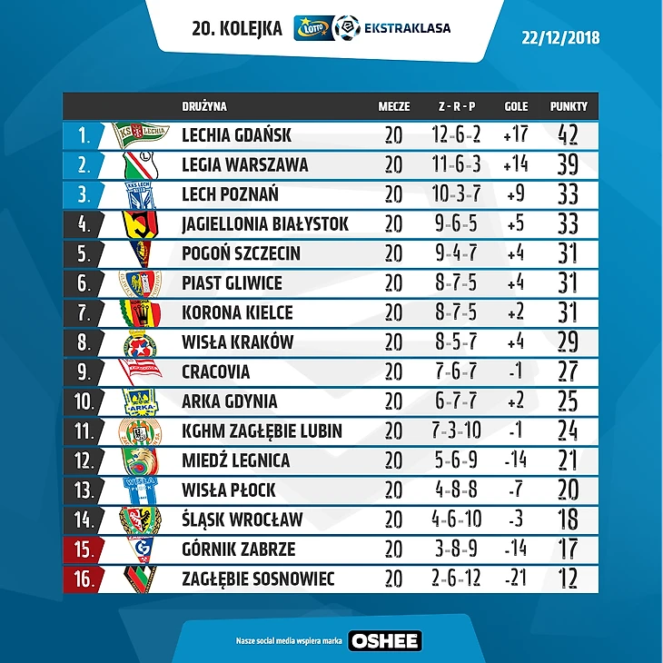 Гданьская «Лехия» завершала 2018-ый год матчем с забжанским «Гурником». После двух ничейных матчей «бело-зеленые» дали шанс «Легии» подняться на первую строчку хотя бы на несколько дней, для того, чтобы вернуть лидерство в Гданьске необходимо было набирать очки с «трёхцветными». «Лехисты» сразу принялись за дело, уже на второй минуте проход Хараслина по флангу завершился опасным прострелом на Собьеха. В первый раз забжан пронесло. Но уже спустя двенадцать минут атака с участием все тех же лиц оказалась голевой. Хараслин пробил по воротам Лоски, а Собьех добил мяч с нескольких метров. Оборона гостей субботним вечером наиграла на крепкую двойку. Раз за разом опорные теряли мяч, что приводило к быстрым атакам в исполнении хозяев, но забить больше в первом тайме у «Лехии» не получилось. Единственный момент у ворот Куцьяка же первые 45 минут возник после подачи с углового, когда Запольник пробивал по воротам словака без какой-либо помехи, но мяч прошел далеко от створа ворот. За пятнадцать минут перерыва забжанам нужно было вернуть уверенность, чтобы попытаться спасти этот матч, но на второй тайм вышел все тот же «Гурник». Спустя пять минут после перерыва, казалось уже, закончившаяся атака хозяев в результате двух ошибок защитников гостей превратилась в точный удар Вольского. А спустя еще четыре минуты стремительная контратака хозяев два в два завершилась точным ударом Младеновича. Забжане вновь попытались ответить угловым, на этот раз Куцьяку даже пришлось вступить в игру. Не забил в Гданьске и лучший бомбардир «Гурника» Ангуло, хотя во втором тайме у него была для этого хорошая возможность. Голевым молчанием Ангуло воспользовался лучший бомбардир гданьчан Пайшау, который догнал Ангуло в списке бомбардиров благодаря своему точному удару головой. При голе португальца снова не обошлось без ошибок защиты гостей. «Лехия» громит соперника и возвращается на лидирующую строчку в таблице, в Забже же зимой нужно что-то серьезно менять, очередной вылет в І лигу там вряд ли ждут.