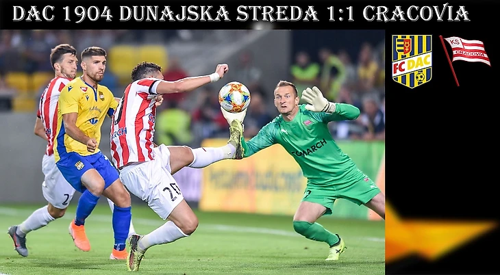У «Краковии» соперник был куда серьезнее - словацкий «ДАК», клуб из Дунаской Стреды отличается своеобразием, о котором Вы можете прочитать в отдельном материале. В стартовом составе краковчан вышло сразу несколько новичков: в нападении вышла пара Рафаэл Лопес и ван Амерсфорт. Хозяева начали матч активнее и могли забить быстрый гол, но Пескович справился с ударом Виды. Голландец, проводивший первый официальный матч за «полосатых» мог отметить и дебютным забитым мячом, но удар головой пришёлся в перекладину ворот «ДАК». Ближе к перерыву «Кракса» прибрала инициативу к своим рукам. Дамбровски вышел на ударную позицию и пытался пробить в дальний угол, но Едличка стоял стеной в воротах «желто-синих». Спас свою дружину Едличка и после удара Рафаэля Лопеса. но уже спустя минуту голкиперу хозяев пришлось капитулировать. Краковчане запрессинговали соперника на чужой половине поля, отобрали мяч и довели атаку до удара ван Амерсфорта, мяч после удара голландского форварда попал в защитника хозяев, что дезориентировала Едличку, который не сумел справиться с рикошетом. Подопечные Михала Пробежа заслуженно повели в счете. Но еще до перерыва словаки сравняли счет на табло. После прострела с правого фланга возникло недопонимание между защитников и голкипером гостей, что привело к тому, что Дивкович наносил удар практически по пустым воротам, в этом моменте, кстати, тоже не обошлось без рикошета. Во втором тайм хозяева перехватили инициативу. Кальмар мог вывести свою команду вперед дальним ударом, и снова рикошет усложнил задачу Песковичу. «Красно-белые» стали слишком часто терять мяч на своей половине поля, чем пытались воспользоваться хозяева поля, но до по-настоящему опасных моментов у ворот Песковича не доходило. Самый реальный шанс вырвать победу возник у хозяев на 94-ой минуте, когда после подачи со штрафного Кружляк не сумел нормально пробить, позволив Песковичу забрать мяч в руки. «Краковия» увозит из Дунайской Стреды результативную ничью и хорошие шансы на проход в следующий раунд, однако легко в Кракове в четверг точно не будет.
