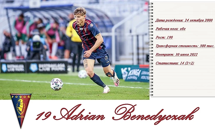 Бенедычак - еще один воспитанник щецинской академии, с которыми мы уже знакомились в ходе серии данных материалов. Сезон 2017/2018 стал для Бенедычака прорывным, он в 19 матчах юниорской команды щецинцев забил 17 мячей, чем заслужил внимание тренерского штаба основной команды и дебютировал в Экстракласе. В следующем сезоне Адриан получил уже больше игровой практики в элите польского футбола. Но во второй части сезона Адриан стал основным форвардов резервной команды «портовцев», где был одним из лидеров, записав на свой счет 6 мячей в 11 встречах.