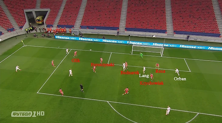 Но снова защита поляков допустила ошибку. На 78-ой минуте началось все с неудачного приёма мяча от Берешиньского, который подарил мяч венграм в своей штрафной, поляки почти выжали соперников из своей штрафной площади, но на этом атака хозяев не закончилась, последовала подача в штрафную, где поляки бросили Ланга, а Реца встречал Орбана в полуприседе.