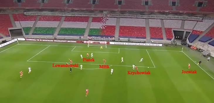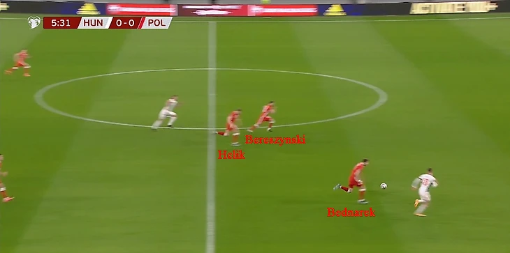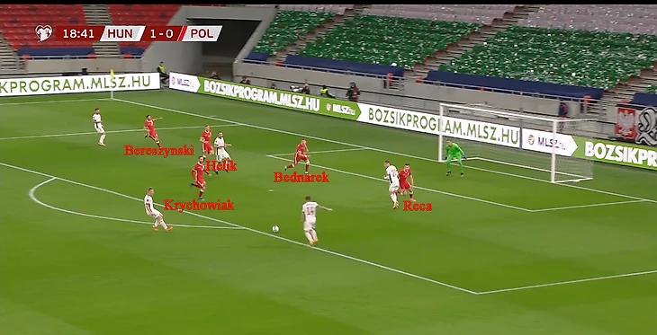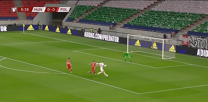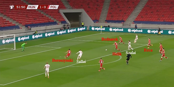 Уже на 6-ой минуте высокая линия обороны поляков позволила венграм выйти вперед. Беднарек, Берешиньски и Хелик располагались в центре поля, ничего не подозревая, но вброс аута Рецы закончился перехватом и длинным пасом на Шаллаи, который стартовал фактически со своей половины поля. Догнать форварда «Фрайбурга» пытался Ян Беднарек, но защитнику «Саутгемптона» не хватило скоростных качеств.