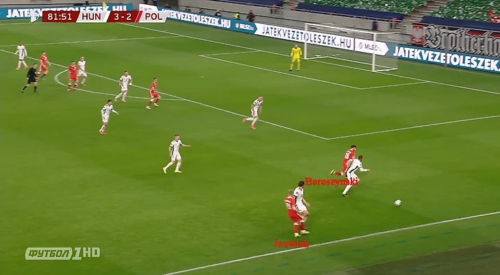 Камиль получил пас на правом фланге и жестом показал Берешиньскому, чтобы тот забегал в его зону. Бартош моментально последовал совету Южвяка и получил от того передачу. Через несколько секунд Берешиньски найдёт подачей в штрафной Левандовского, который с левой ноги пробьет прямо в девятку ворот венгров и установит окончательные цифры на табло 3:3.