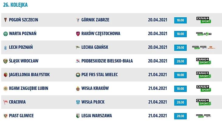 Пока в Европе все озабочены новостями о создании Суперлиги и реформами Лиги Чемпионов, в Польше озабочены своими вопросами. В минувшие выходные прошёл 25-ый тур, а уже сегодня начинается 26-ой. «Легия» оставляет надежды «Погони» на возможную борьбу за чемпионство, а «Лехия» и «Пяст» разыграли настоящий триллер в борьбе за потенциально еврокубковое 4-ое место, на которое теперь претендует и «Варта», рассматривавшаяся в качестве главного аутсайдера чемпионата перед его стартом.