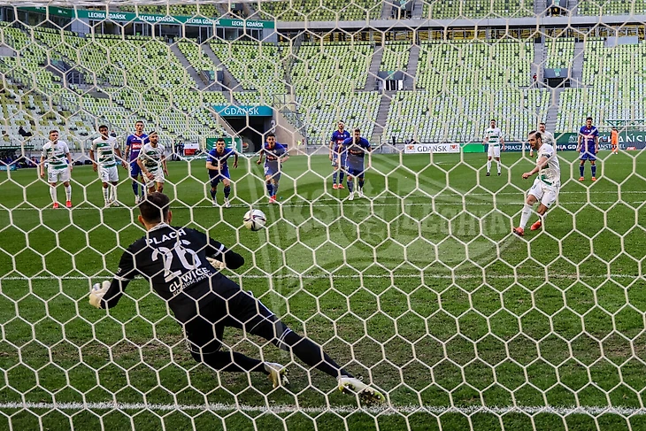 А на 87-ой минуте счетчик сухой серии Францишка Плаха остановился на цифре 527 минут, что является рекордом нынешнего сезона в Экстракласе. После передачи с фланга Калюжински умудрился непостижимым образом угодить с нескольких метров в штангу, но Зволински показал молодому партнёру, как нужно реализовывать подобные моменты, добив мяч в сетку. Забитый мяч завёл гданьчан, которые уже не верили, что смогут зацепить очки в этом матче. Но на 92-ой минуте все могло закончиться окончательно. Вышедший на замену молодой украинец Мусолитин сфолил в своей штрафной и арбитр закономерно назначил пенальти. К мячу подошёл Йодловец и бесхитростно пробил по центру ворот - Куцьяк из антигероя превратился в героя матча. А спустя две минуты мяч стоял на одиннадцатиметровой отметке в противоположной штрафной. Хук сфолил на Пайшау, португалец сам подошёл к мячу и принёс ничью «Лехии».