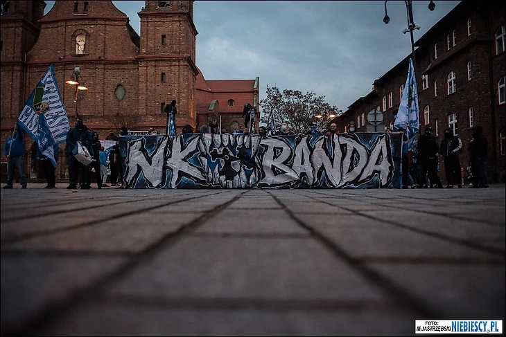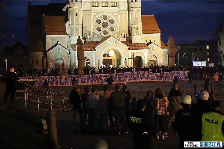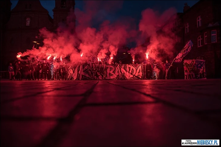 Руда Слёнска. Здесь тоже поддерживают «Рух», который, на секундочку, играет в четвертом по силе дивизионе Польши. Местные фанаты собрались на площади Яна Павла II-го. К дню рождения они подготовили баннер «в течение 101 года это наш синий мир» и, конечно же, пиротехнику.