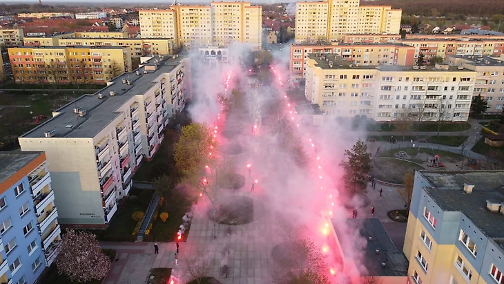Последним именинником на этой неделе были щецинские «портовцы». 21-го апреля 1948-го года была основана щецинская «Погонь». В самом Щецине, вроде как, не было серьезных празднований, а вот в городе Полице (41 тысяча жителей), где проживает часть фанатов «Погони» эту дату отметили пирошоу из 73 файеров. Не только количество пиротехники было выбрано неслучайно, время начала акции - 19:48 отсылает нас к году основания «Погони».