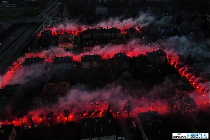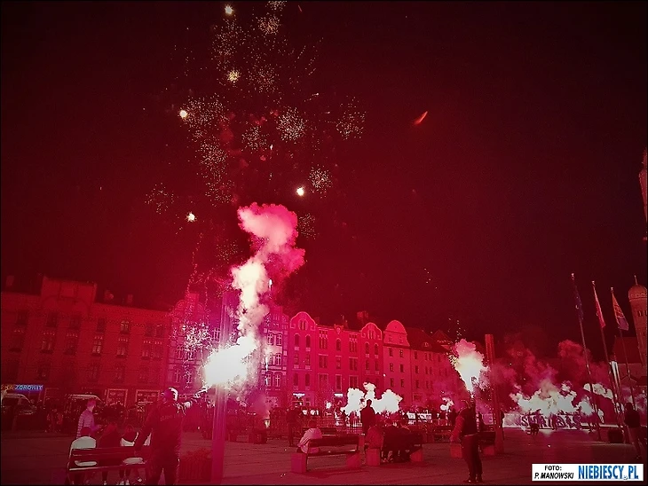Во вторник основные празднования прошли в Хожуве. Фанаты «синих» около стадиона своих любимцев зажгли пиротехнику, образовав число 101, такие цифры затушить будет точно не просто.