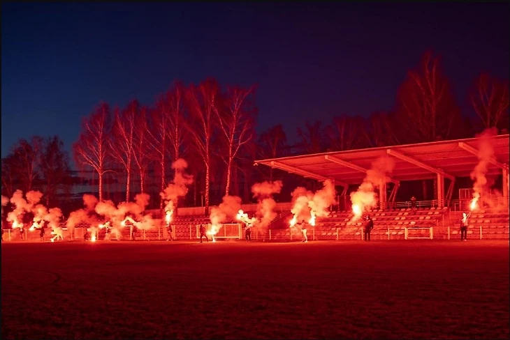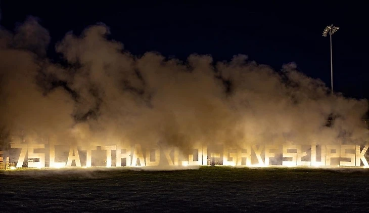 В прошлом посте мы увидели, как праздновали дни рождения в Хожуве, Щецине и Тыхах. На очереди Слупск - город в Поморском воеводстве, в ста километрах от Гданьска. Местный «Грыф» выступает в IV-ой лиге (пятый дивизион Польши). Несмотря на наличие в регионе более сильных «Лехии» и «Арки» в Слупске достаточно людей поддерживает именно местный «Грыф». 26-го апреля фанаты «Грыфа» собрались на домашнем стадионе клуба. К 75-летию клуба был подготовлен баннер «75 лет традиции - «Грыф» Слупск» и большое количество пиротехники.