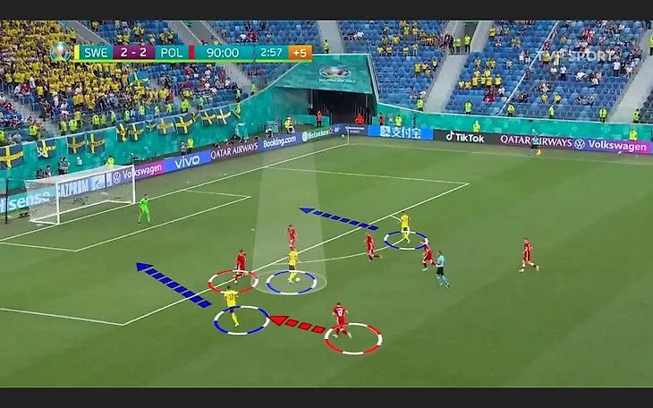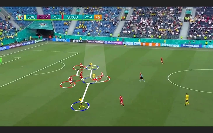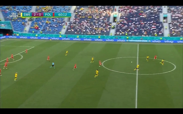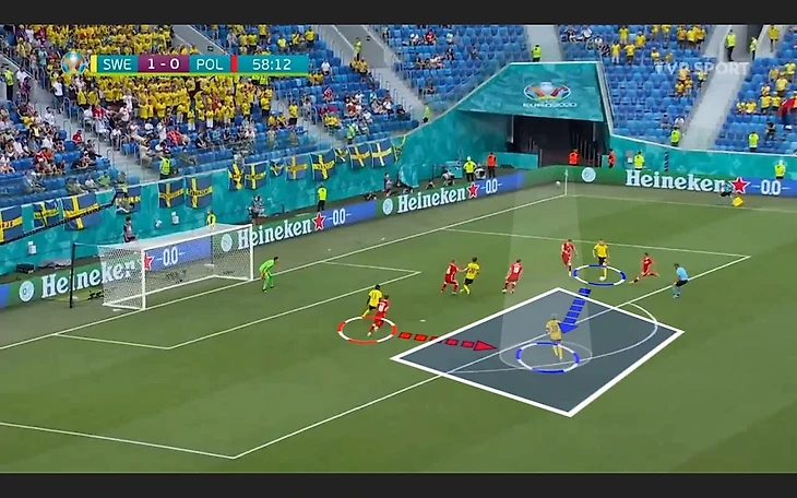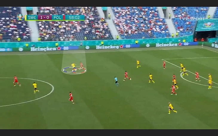 Но выбрал Франковски худший вариант - он просто врезался в Кулусевского и упал на газон. Кулусевски ворвался в штрафную и без особых проблем ушел он не самого подвижного Беднарека. Но и здесь еще все было не критично, поляки успели вернуться и их было даже на одного больше, чем шведов. Была лишь одна проблема - Форсберга никто не накрывал. Причём на повторе будет видно, что Берешиньски дважды бросал взгляд назад на Форсберга, но решил пойти за Исаком, которого тоже никто не держал. Это решение Берешиньского стало роковым, Кулусевски выкатил мяч под удар своему партнёру, который оформил дубль.