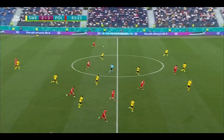 Но стенка в короткий пас Люстига и Ларссона быстро отрезала Тымотеуша Пухача, который в очередной раз продемонстрировал свои не лучшие оборонительные качества. Мяч довели до Исака, но по-прежнему ситуация не выглядела всерьёз опасной, но дальше случилась череда неудач.