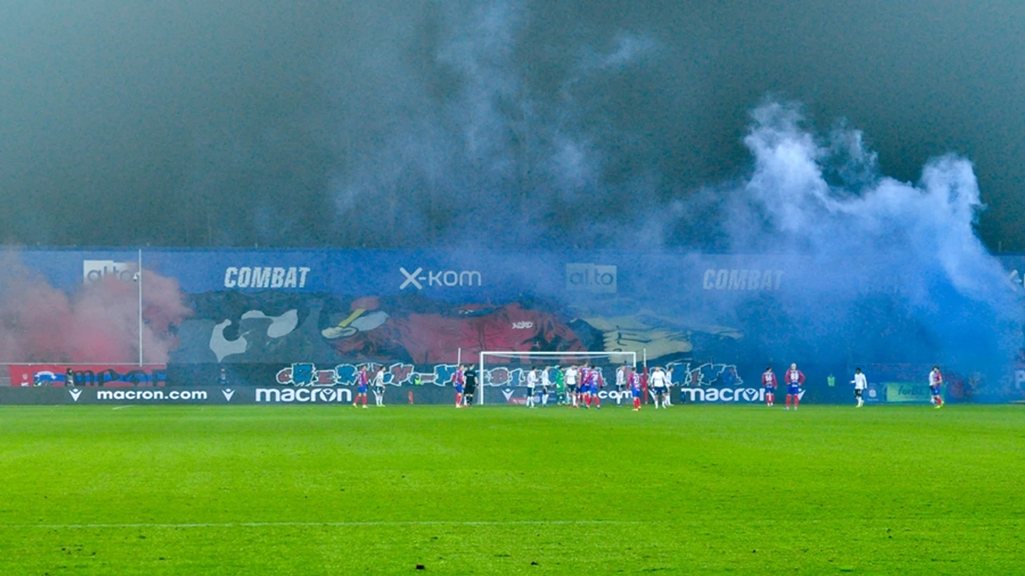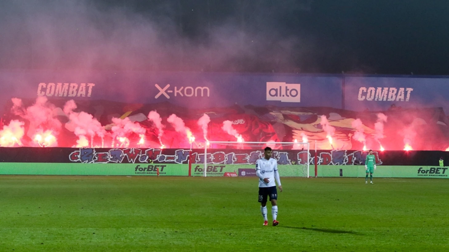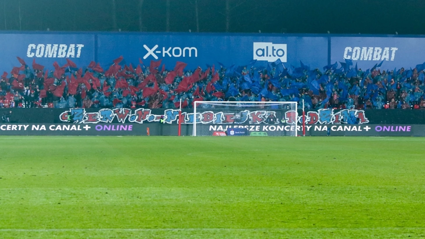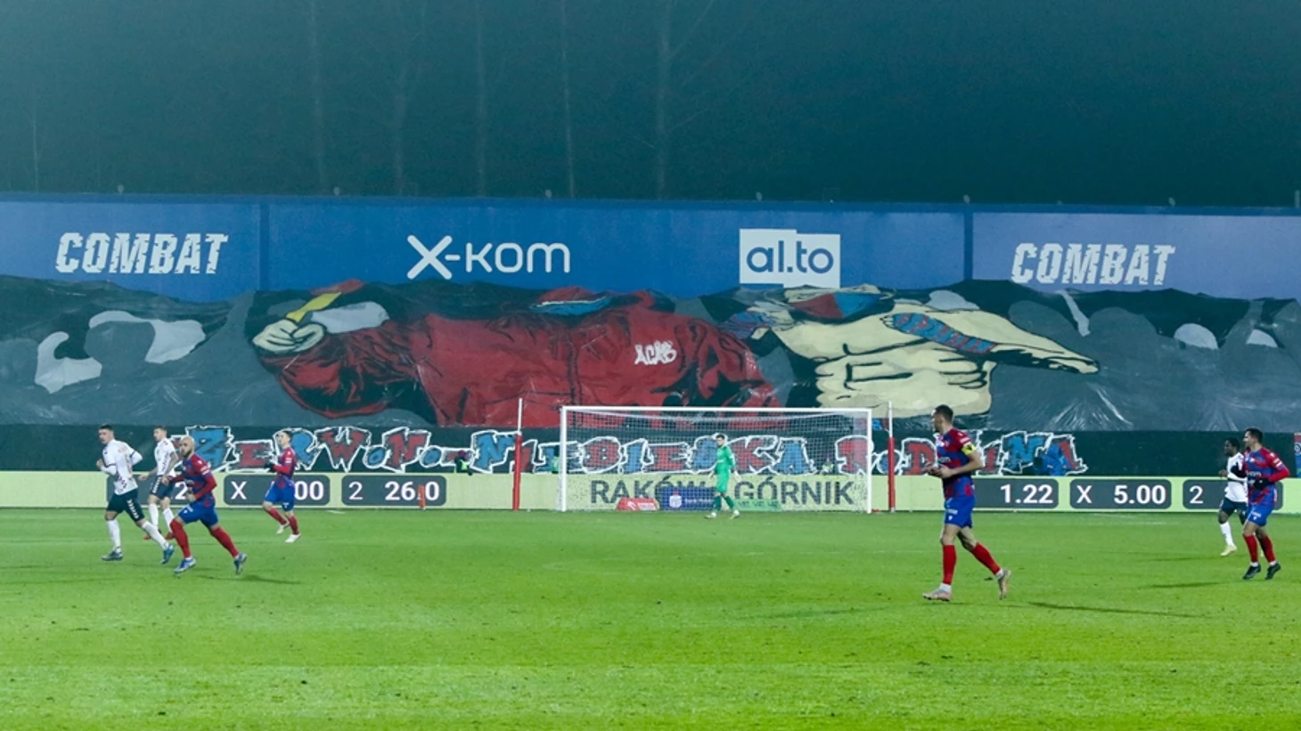 Одна из первых оправ фанатов «Ракува» на обновленном стадионе. На матче с забжанским «Гурником» 15-го декабря ченстоховцы подготовили перформанс "Красно-синяя семья".
