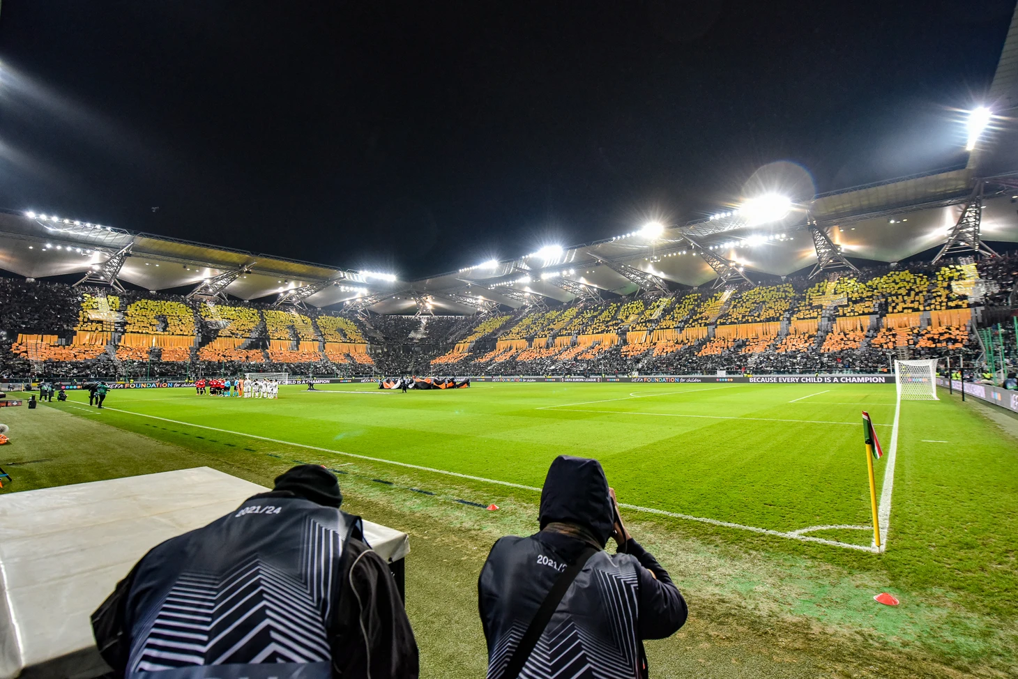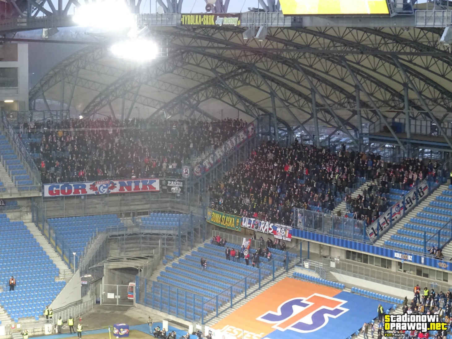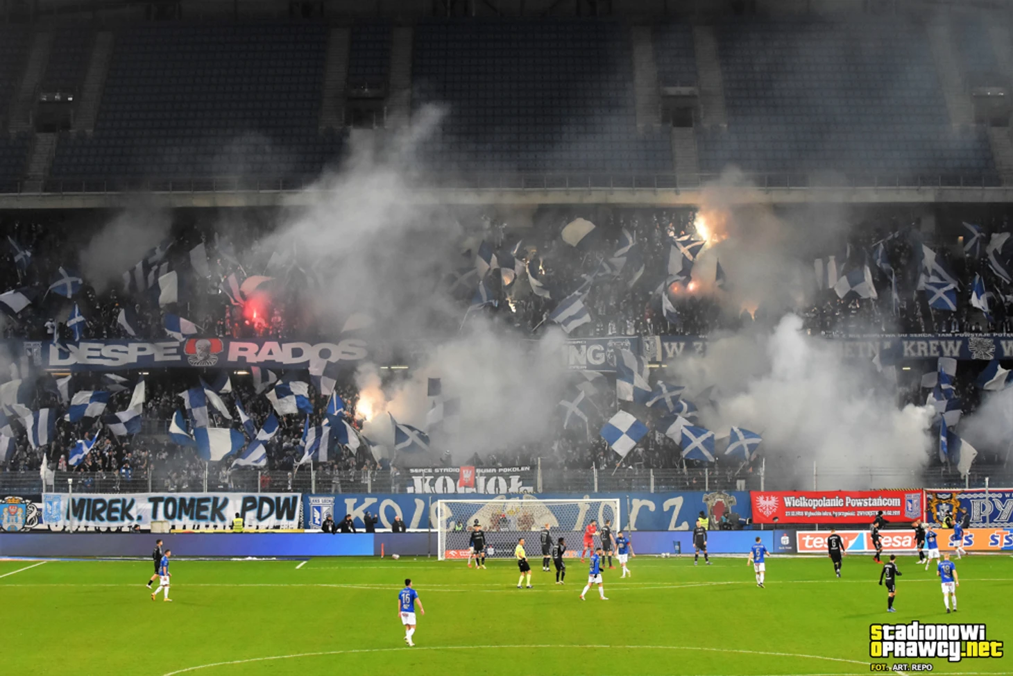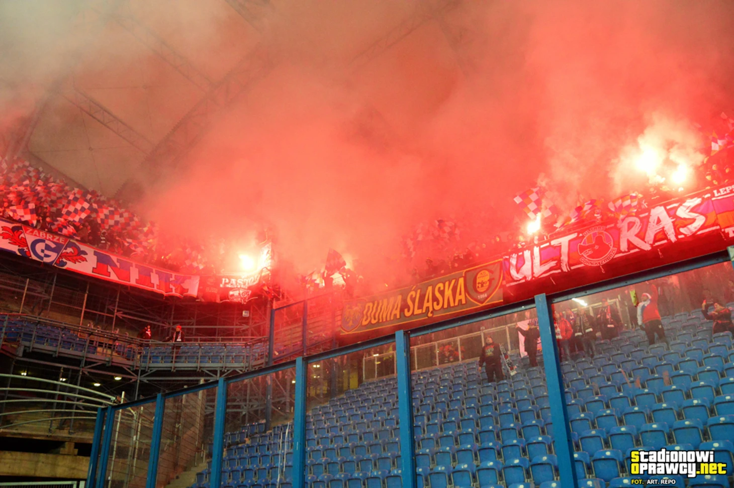 Одна из первых оправ фанатов «Ракува» на обновленном стадионе. На матче с забжанским «Гурником» 15-го декабря ченстоховцы подготовили перформанс "Красно-синяя семья".