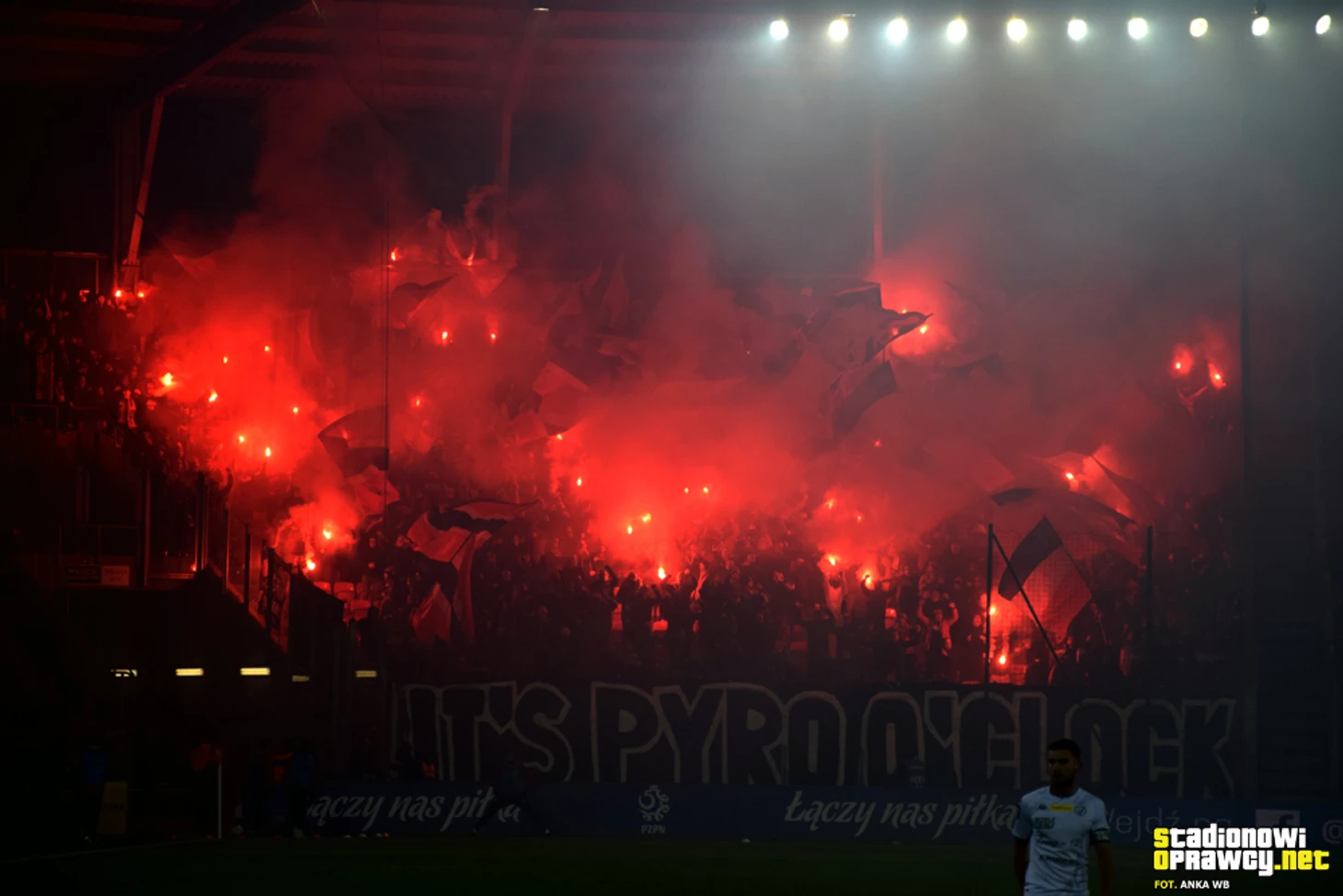 Краковчане, несмотря на будний день, полностью заполнили гостевой сектор, и показали оправу "Это время пиротехники".