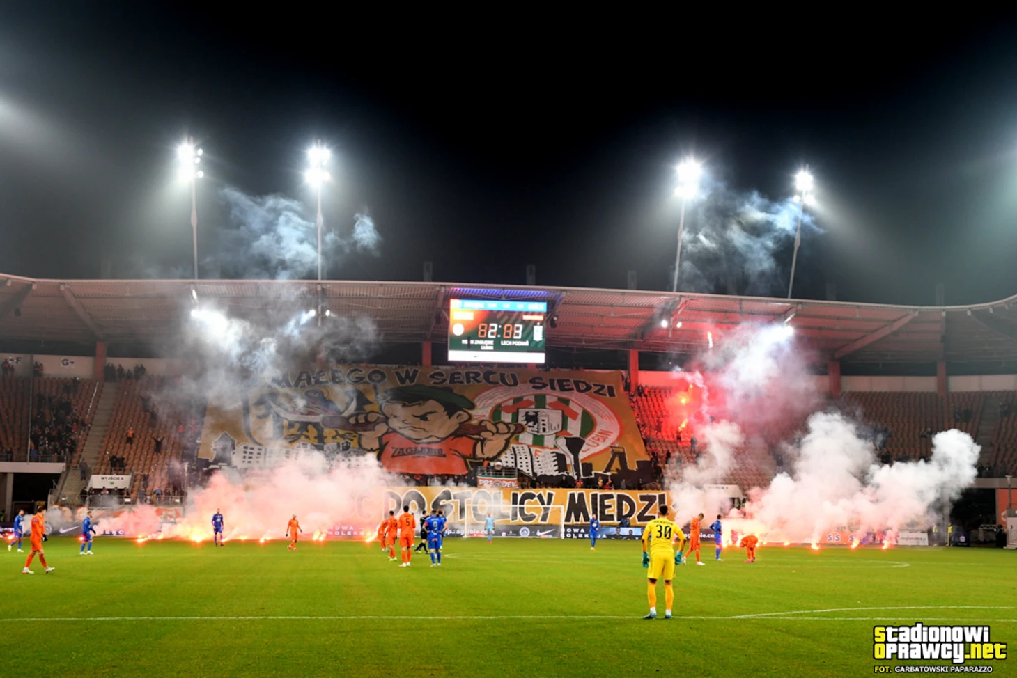В Любине, как в и Бельско-Бялой, не обошлось без празднования дня шахтера. Хозяева подготовили оправу "С малых лет в сердце сидит любовь к столице меди". Не обошлось и без пиротехники, которая довольно быстро полетела на футбольное поле.