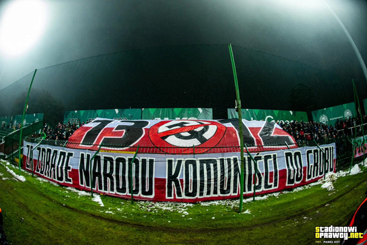 Схожую оправу показали фанаты вроцлавского «Шлёнска» на выезде в Гродзиск Велькопольски - "За предательство народа коммунистов в гроб".