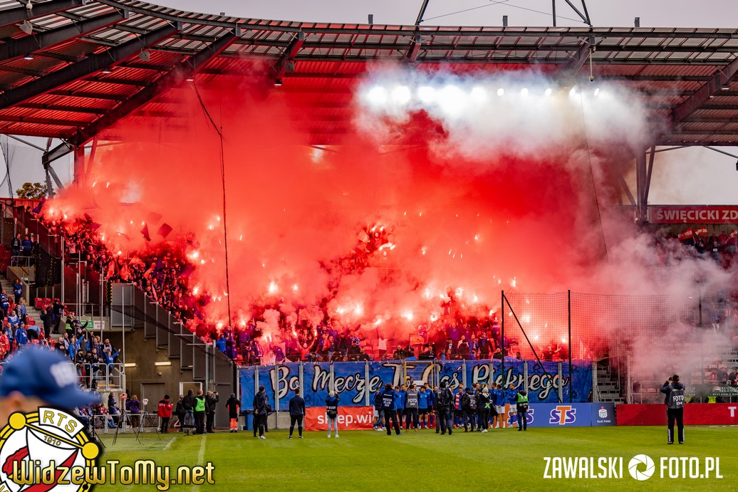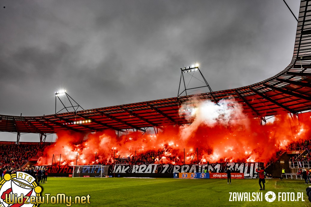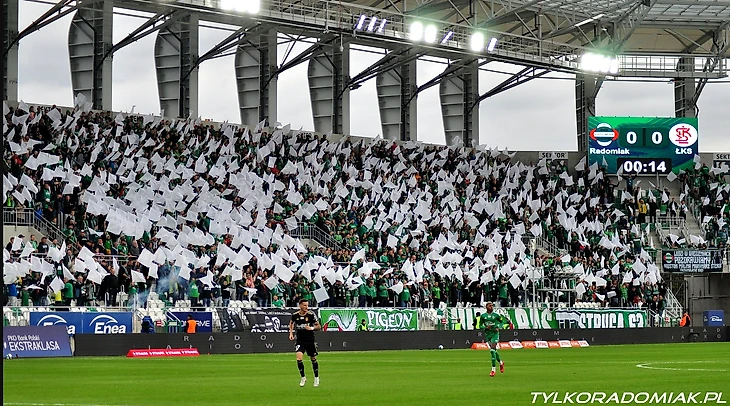 Фанаты «Радомяка» на матче с «ЛКС» устроили перформанс с использованием небольших флагов в цветах своего клуба, а также пиротехники.