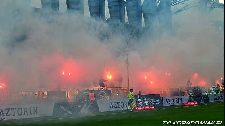 Из Познаня на матч приехало большое количество болельщиков «железнодорожников», которые также пожгли пиротехнику.