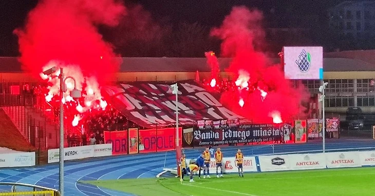 Пирошоу фанатов бытомской «Полонии» на выездном матче с калишским «ККС».