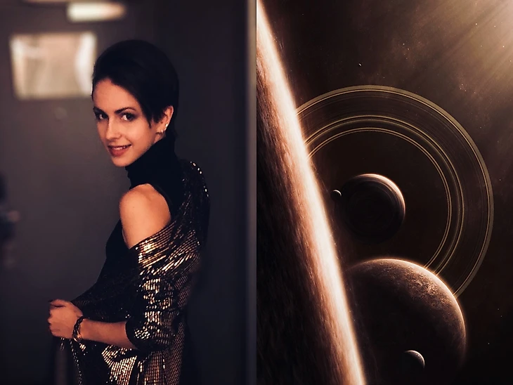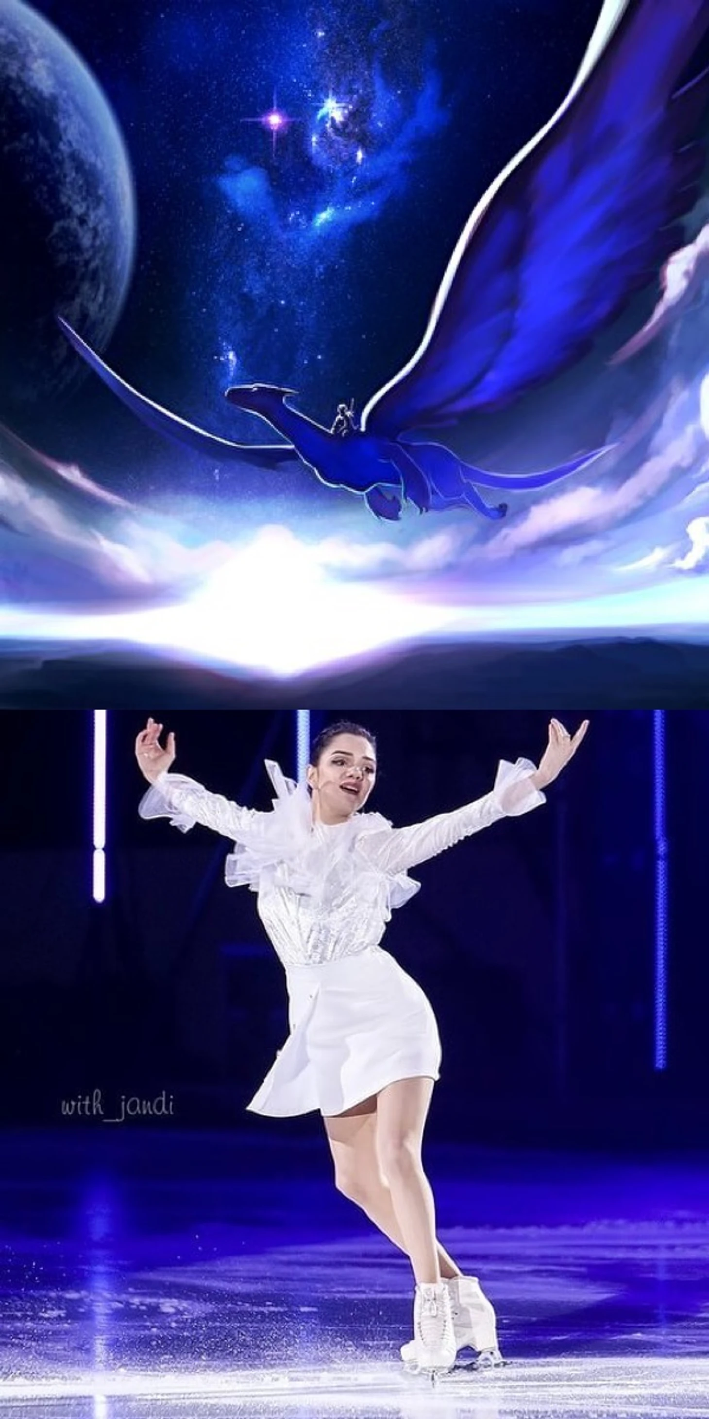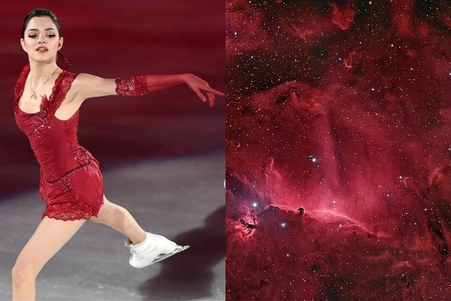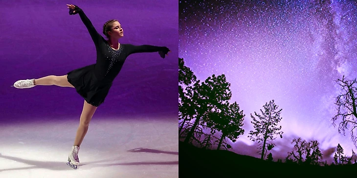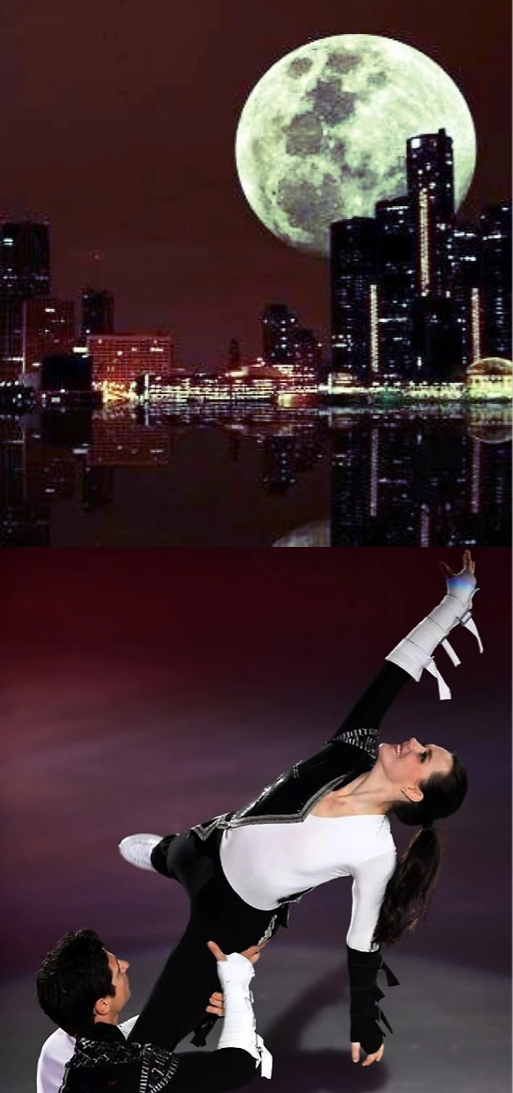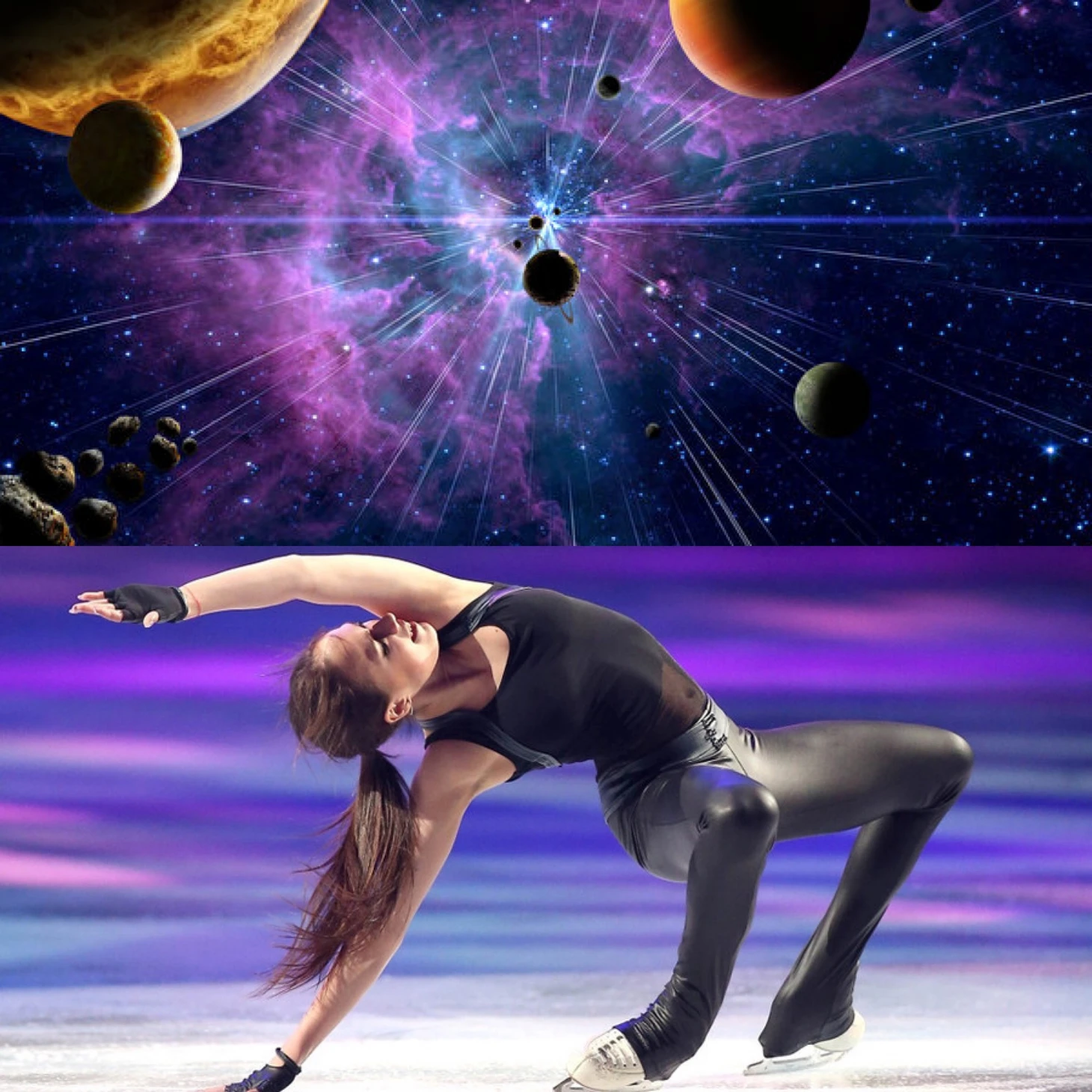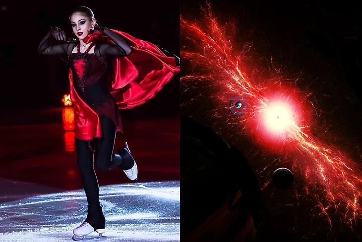 Прямо заворожили коллажи с Лизой(город), с Сашей( фантастическое слияние двух картинок, полное ощущение, что Саша, закрывая руками лицо, смотрит на планету, даже свет совпадает) , с Юлей по той же причине( катается она на льду озера в обрамлении тех самых деревьев и опять точнейшее попадание в свет), с Алиной( где астероидный дождь и кантилевер, вновь свет и совпадение горизонтали с вертикалью), с ЗЭ( настроение, свет, цвет, направление ноги Наташи, словно это её конёк оставил тонкие линии на соседней картинке), с Адамом( это вообще контрольный выстрел, потому что сгусток материи и группировка совпали идеально).