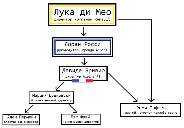 Если вы запутались в новой структуре управления команды Alpine, я составил для вас примерную схему: