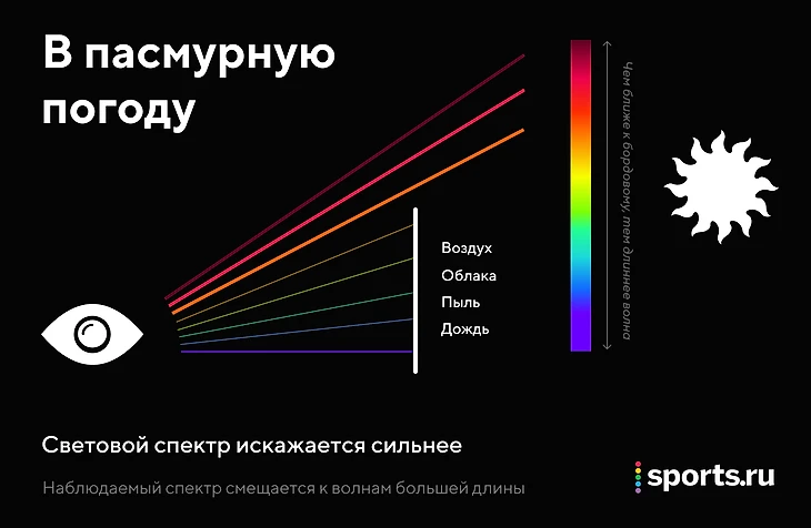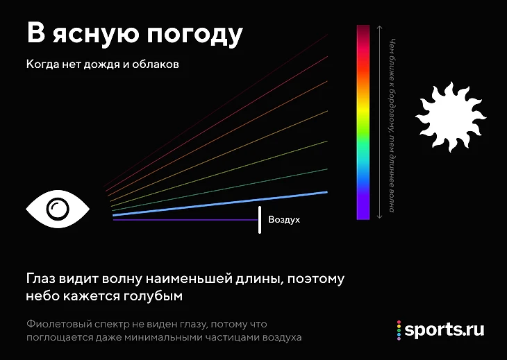 «Чем короче длина волны (это фиолетовый, синий, голубой и зеленый цвета), тем солнечный свет сильнее рассеивается. Днем ему до наших глаз надо преодолеть путь короче, чем во время заката, поэтому успевают рассеяться только короткие длины волн, – рассказал Sports.ru Владимир Ларин, преподаватель физики и исполнительный директор Новой школы в Москве. – Поэтому нам кажется, что небо светит синим цветом, но на самом деле это солнечный свет, который куда-то попал в атмосфере, рассеялся и пришел в наши глаза.