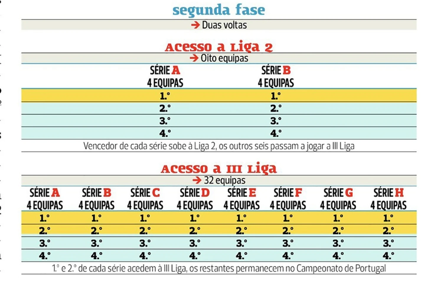 Как известно, сейчас третий по силе дивизион Португалии, именуемый также как Национальное первенство, разделён на четыре Серии, в которых суммарно выступают 72 команды (по 18 в каждой- прим. редактора). По итогам чемпионата, разбитого на два круга, команды, занявшие первые две строчки в каждой из Серий, разыгрывают между собой две путёвки в Сегунду. Что касается, команд, оказавшихся в зоне вылета, они отправляются в региональные соревнования и на смену им приходят представители этих самых соревнований. Теперь всё будет иначе.