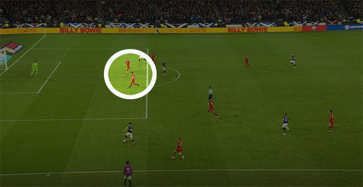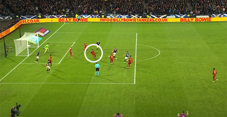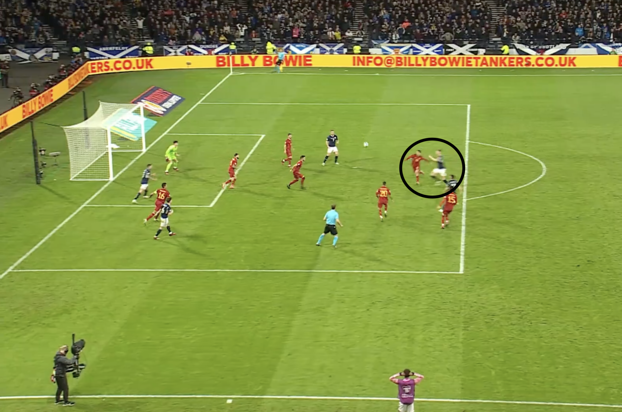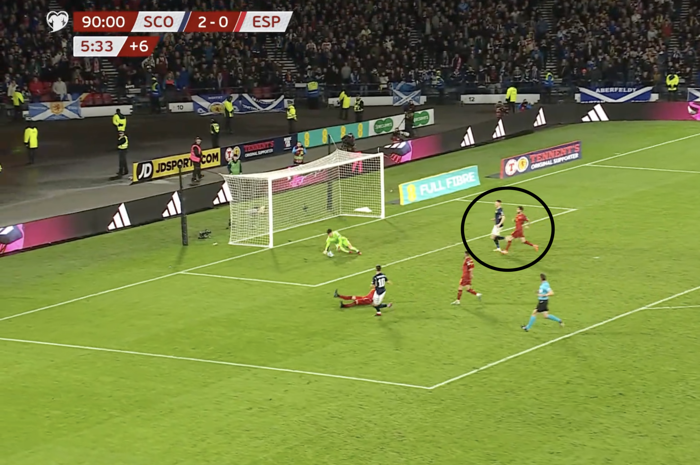 Против Кипра Скотт играл выше − а вот с Испанией показал неожиданный (для соперника) прием: рывки в штрафную из центра поля. Испанцы оказались не готовы.