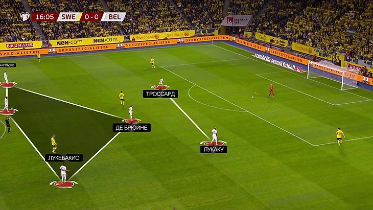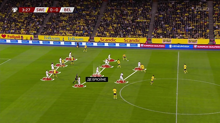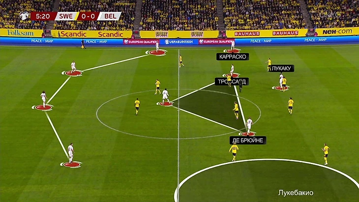 При позиционных атаках мы наблюдали еще одну трансформацию – Лукаку оставался единственным нападающим, Троссард и Де Брюйне делили полуфланги, а Карраско и Лукебакио отвечали за ширину: