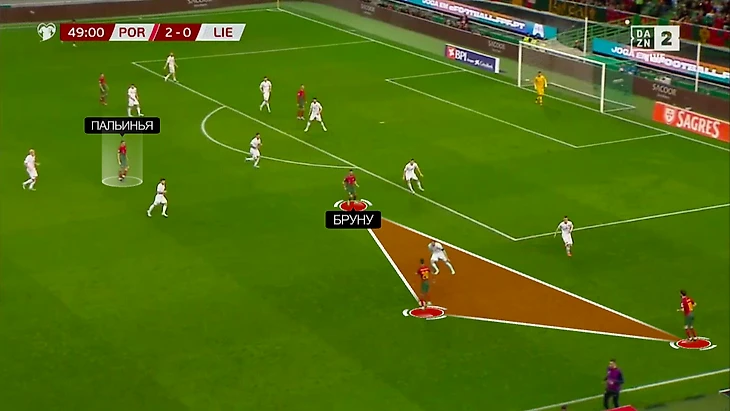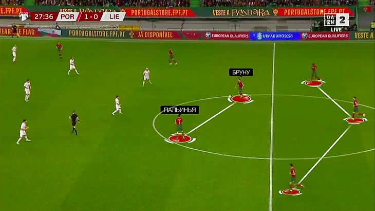У португальцев в опорной похожая связка из Пальиньи и Бруну Фернандеша с похожим распределением ролей. Жоау рассказывает, что задача, которую дал Мартинес, – балансировать игру (прямо как у Витцеля в Бельгии). Фернандеш же действует в манере КДБ – больше настроен на атаку и комбинации, в основном – через правый фланг: