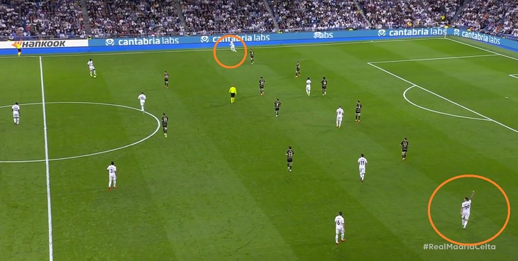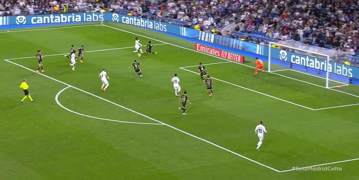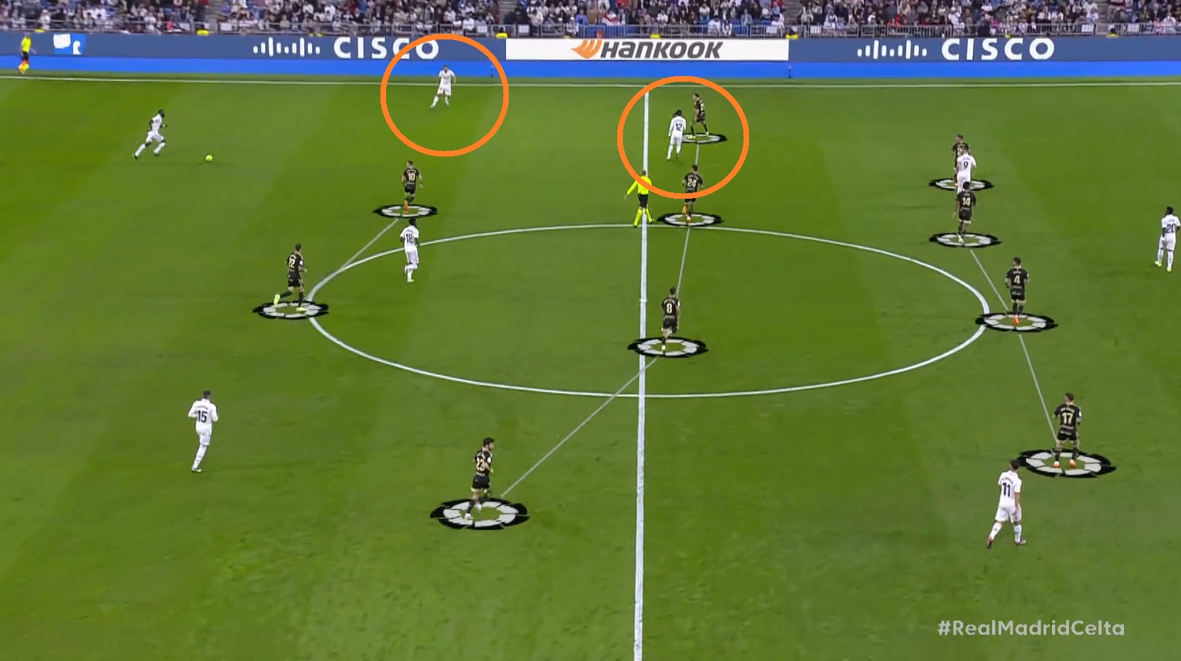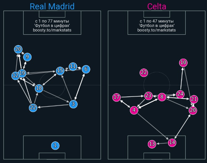Еще раз отмечаем перекос атак на левый фланг (любовь Анчелотти, наличие Винисиума и Камавинга + любовь Бензема к смещению) – «Сельте» приходилось адаптироваться и тоже сваливать большое количество игроков направо.