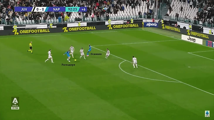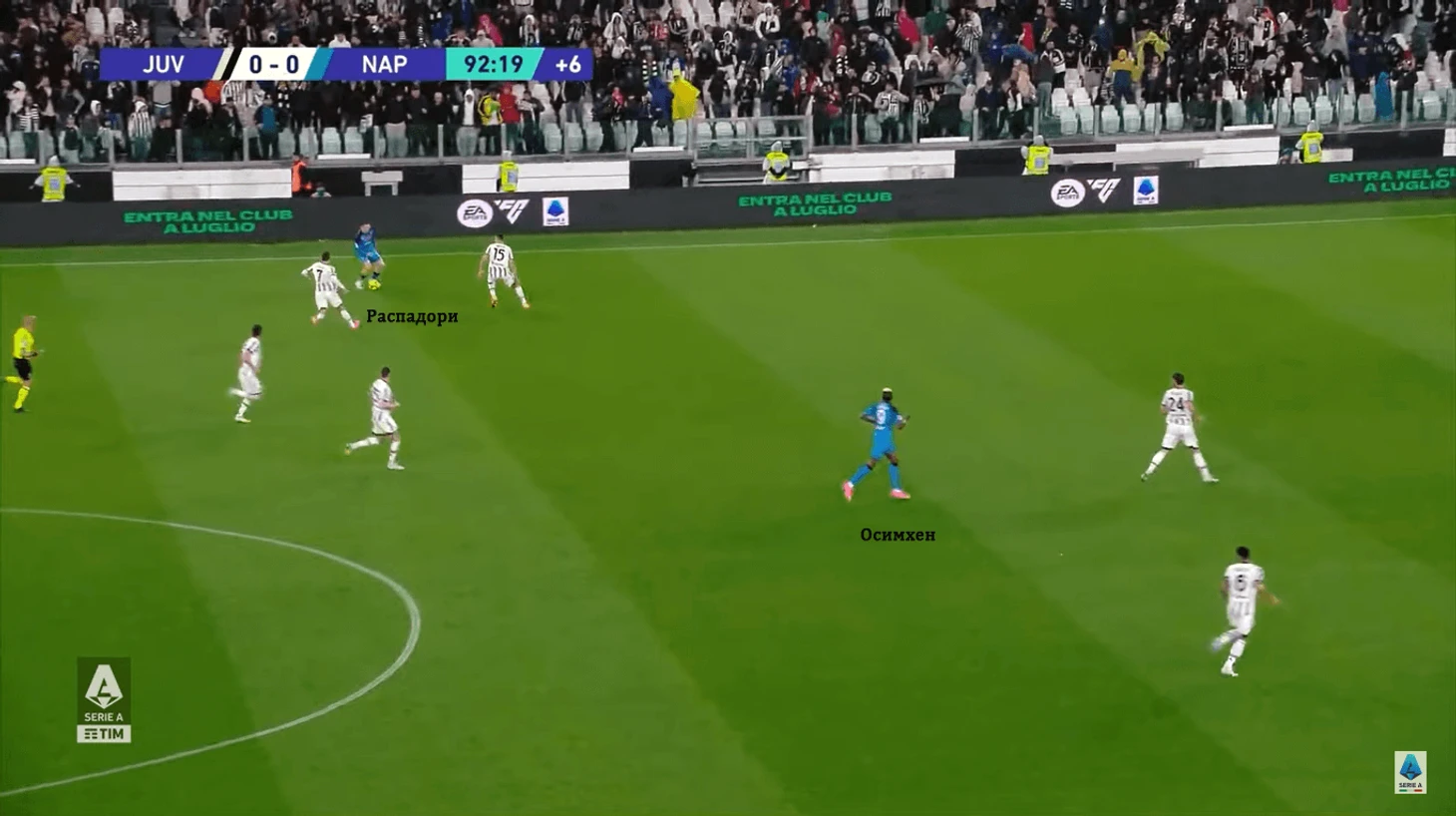 Так удивительная способность Распадори привлекать внимание снова оставила Осимхена без присмотра: на скрине видно, что все защитники смотрят на итальянца. «Наполи» должен был забивать уже здесь, но нигериец далеко отпустил мяч на приеме и запорол выход один на один.