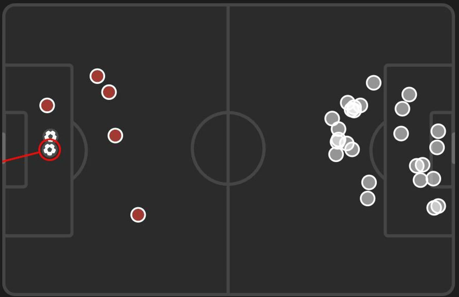 3. Игровой рисунок располагал к подобному. «Байер» провел матч с 37% владения, стабильно защищаясь в низком блоке 5-4-1. «Лейпциг» после перехода на 3-4-3 в недавних матчах наращивает число пасов за спины, здесь же вообще не получалось – и сами плохо открывались, и «Байер» не давал пространства.