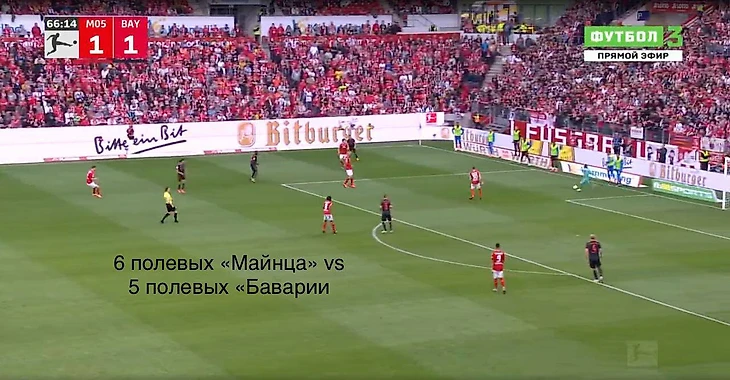 Вот тот самый прессинг, когда полевых «Майнца» у штрафной «Баварии» больше, чем полевых «Баварии».