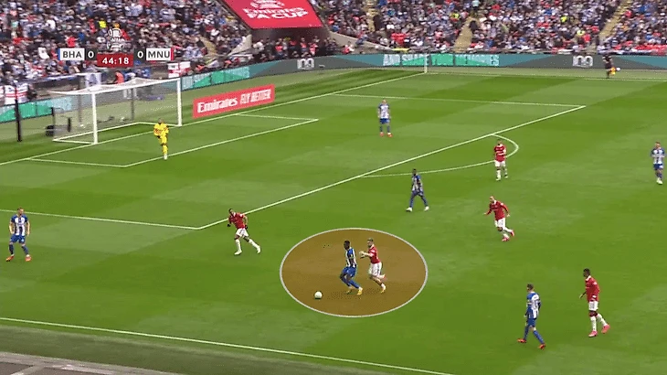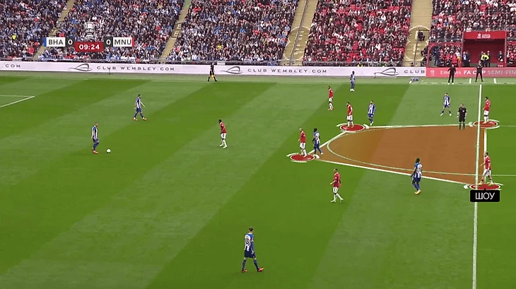 Показательно, что по ходу матча «Брайтон» несколько раз менял схему розыгрышей, а основную остроту создал после подключений крайних защитников – главное направление и наигранные перепасовки выключил прием Тен Хага. В основное время команда Де Дзерби нанесла только 5 ударов с игры – это в два раза меньше их среднего показателя по сезону (12).