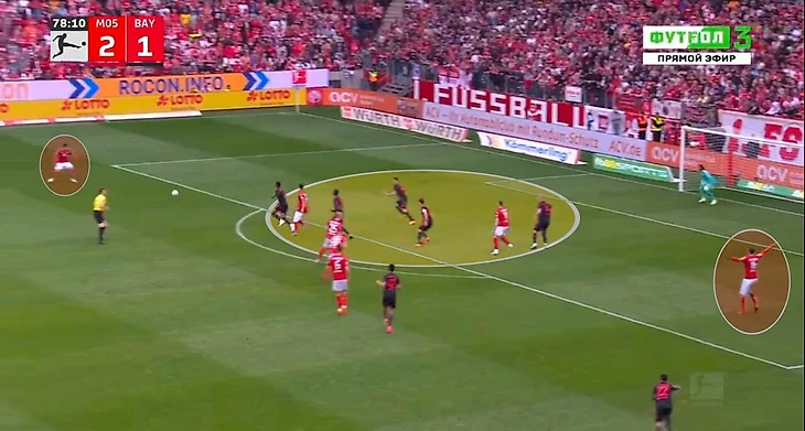 К инертности и неспособности ужалить «Майнц» в ответ «Бавария» добавила ужасы позиционной обороны. Ситуация перед третьим голом: 5 футболистов в центральной оси, никого нет ни рядом с подающим слева, ни рядом с готовым открыться на дальнюю штангу справа.