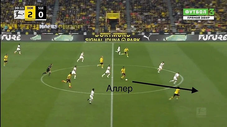 Подыгрыш – очень сильная сторона Аллера. Он классно играл на команду и в «Айнтрахте», и в «Аяксе». Умеет сохранять мяч спиной к воротам, вовремя отдает темповые пасы, помогает ближе к флангам, трудится без мяча. В «Дортмунде» потихоньку привыкает качественно делать то же самое. Очень полезно, когда рядом есть набравшие форму Адейеми и Мален, готовые подбирать мяч и разбивать чужую защиту.