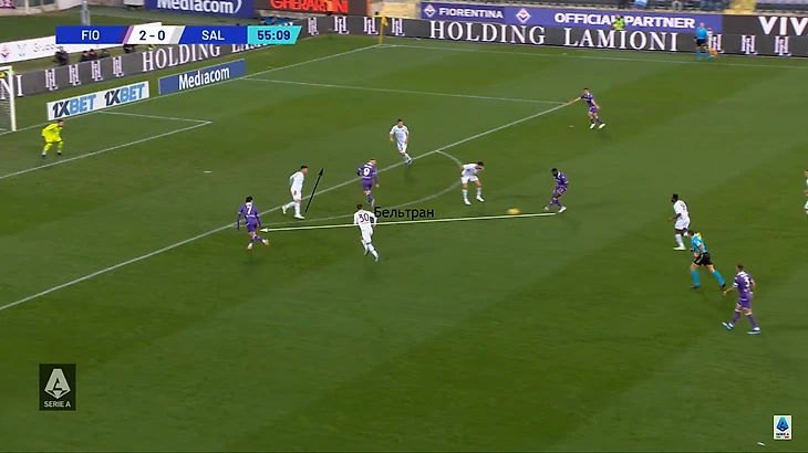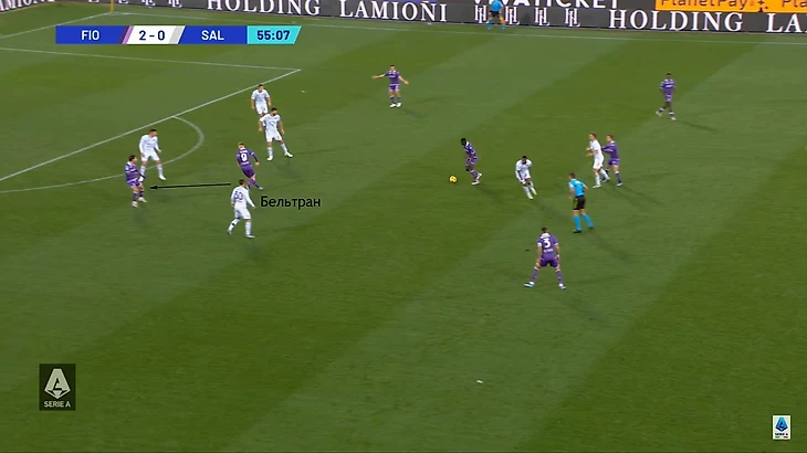 Ключевая атакующая проблема «Фиорентины» – настолько высокое и массированное владение, что против автобусов часто остаются одни навесы. В матче с «Салернитаной» (3:0) Лукас Бельтран показал альтернативный вариант. Его интеллектуальное движение обеспечило два мяча: первый (увел защитника на полуфланг, освободив коридор под забег Артура) и третий.