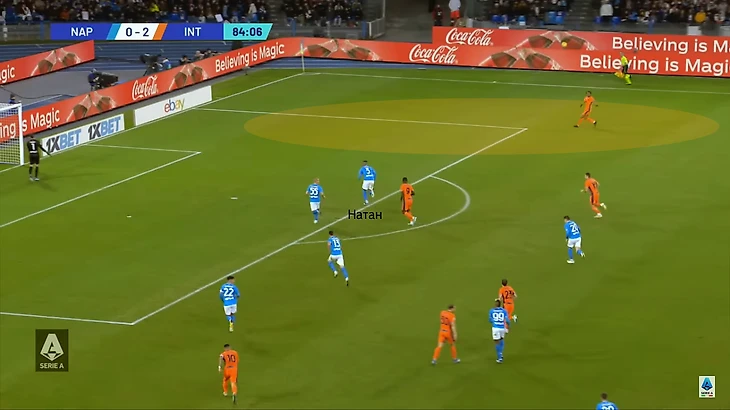 На скрине последний гол: проход по правому крылу, забытому из-за узкой позиции Натана. Это типичная ситуация. Первые два мяча родились из разрывов обнаженного противоположного края – Ди Лоренцо застревал в высокой позиции.