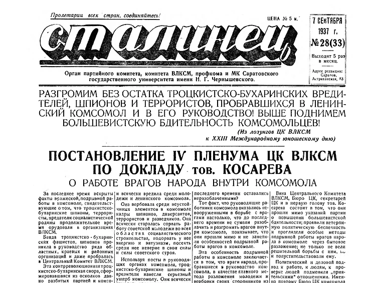 Первый секретарь ЦК ВЛКСМ Александр Косарев, принявший активное участие в чистке рядов комсомола от врагов народа, будет арестован 28 ноября 1938 года, а расстрелян 23 февраля 1939 года.