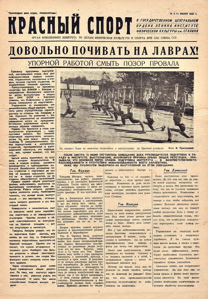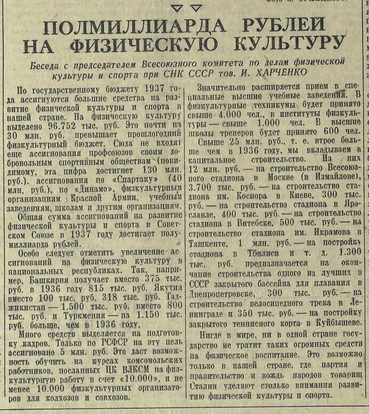 От автора: «17 июня 1937 года под председательством товарища В.М. Молотова состоялось очередное заседание Совета Народных Комиссаров СССР. Совнарком обсудил доклад Председателя Всесоюзного Комитета по делам физкультуры и спорта т. Харченко о работе Комитета и его основных задачах на 1937 год. При обсуждении этого вопроса, в котором приняли участие тт. Крыленко, Кнопова, Антипов, Косарев, Бубнов, Микоян и Молотов, указывалось, что направление работы Комитета В ОСНОВНОМ ПРАВИЛЬНОЕ».