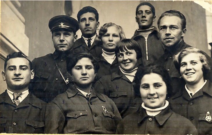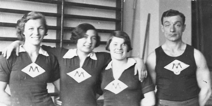 На фото: выпускницы кафедры гимнастики ГЦОЛИФК вместе с Сергеем Луневским. В центре – член сборной Москвы по гимнастике Наталья Ломакина. Осуждена как ЧСИР (член семьи изменника Родины). Ее муж, преподаватель гимнастики ГЦОЛИФК Борис Александрович Калантаров был расстрелян 9 мая 1938 года