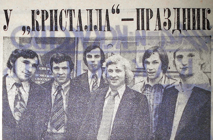 Хоккеисты «Кристалла» – победители в первой лиге: Александр Сафронов, Владимир Шевелев, Виктор Викторов, Владимир Мышкин, Владимир Голубович, Виктор Садомов