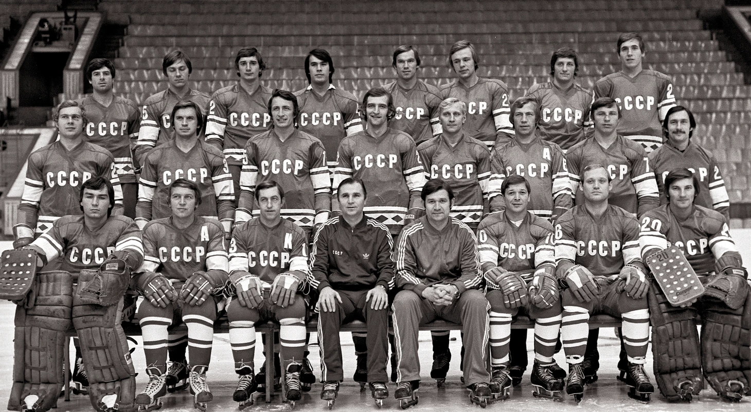 Август 1977 года. Сборная СССР на первом тренировочном сборе Виктора Тихонова. Первый ряд: Сергей Бабарико, Владимир Шадрин, Борис Михайлов, Виктор Васильевич Тихонов, Владимир Владимирович Юрзинов, Александр Мальцев, Владимир Петров, Владислав Третьяк. Второй ряд: Александр Волчков, Владимир Лутченко, Александр Якушев, Виктор Жлуктов, Александр Гусев, Валерий Васильев, Геннадий Цыганков, Хельмут Балдерис. Третий ряд: Валерий Харламов, Василий Первухин, Зинэтула Билялетдинов, Сергей Бабинов, Виктор Шалимов, Вячеслав Фетисов, Сергей Капустин, Александр Голиков / Фото: МИА «Россия сегодня» / Игорь Уткин