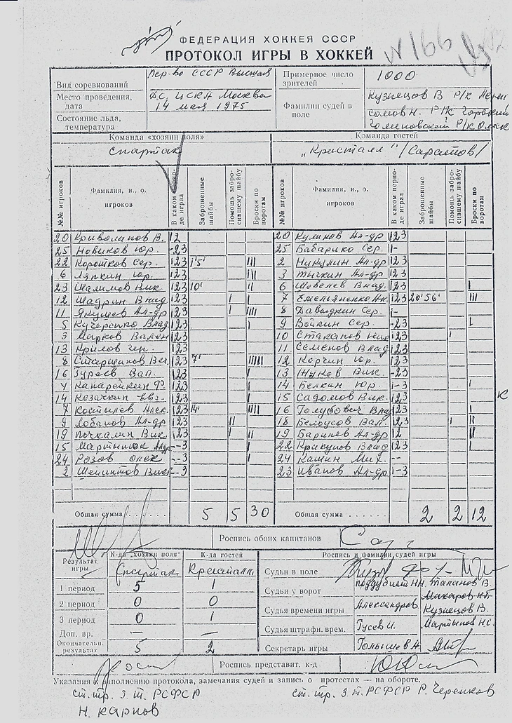 Начался сезон тоже плохо. Первый матч чемпионата против «Спартака», «Лужники», 12 тысяч на трибунах, наши нападающие всю игру просидели в зоне <Виктора> Дорощенко, забросили только одну шайбу, а «Спартак» убегал и забил мне три. После матча старики на меня накинулись: ты чего, молодой, весь результат портишь. А сами-то ничего не забили! И меня перестали ставить в основной состав. (Единственную шайбу у «Динамо» забросил Владимир Голубович с передачи Александра Мальцева. – прим. Ст. Г.).