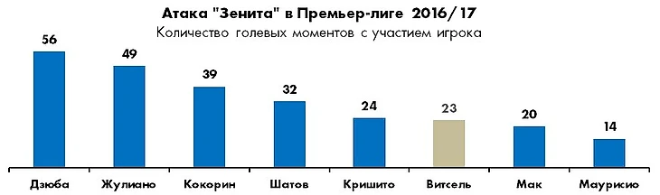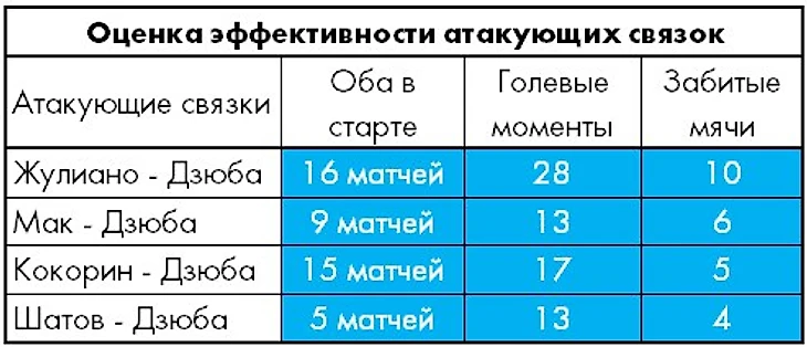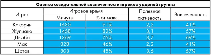 Лидирует Дзюба и в общекомандном рейтинге полезной активности, причем в пересчете на игровое время его текущий показатель заметно выше по сравнению с тем же отрезком прошлого чемпионата (3,7 против 3,0 голевых момента в среднем за матч). И это несмотря на то, что тогда по итогам 20 туров норма голевого созидания «Зенита» была на 20% выше текущего уровня (6,4 против 5,4). Таким образом, в среднестатистическом матче чемпионата доля голевых моментов с участием Артема составляет порядка 70%.